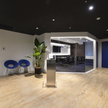 東京本社に続き、大阪支店の開設をお手伝いさせていただきました。東京本社同様に「温かみ」「信頼感」「スタイリッシュ」をキーワードに設計。新しいエッセンスとしてエントランス正面に木パネルを施し、来店された方々に落ち着きを与えられるよう工夫しました。また、随所にコーポレートカラーのブルーを採用し、VIを強調しております。 6部屋ある会議室もそれぞれデザインを変えており、タイル、グラフィッククロス、ガラス、カーペットなど表装面だけでなく、テーブルの天板・脚、チェアの張地といった細部までこだわり抜いてデザインしました。東京本社とはディテールは異なりながらも統一感を出し、ともにファイナンシャルスタンダード様らしさを感じられる空間に仕上げることができました。