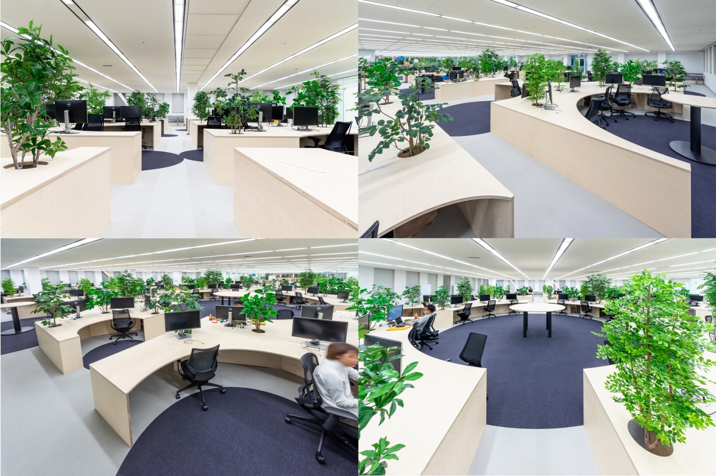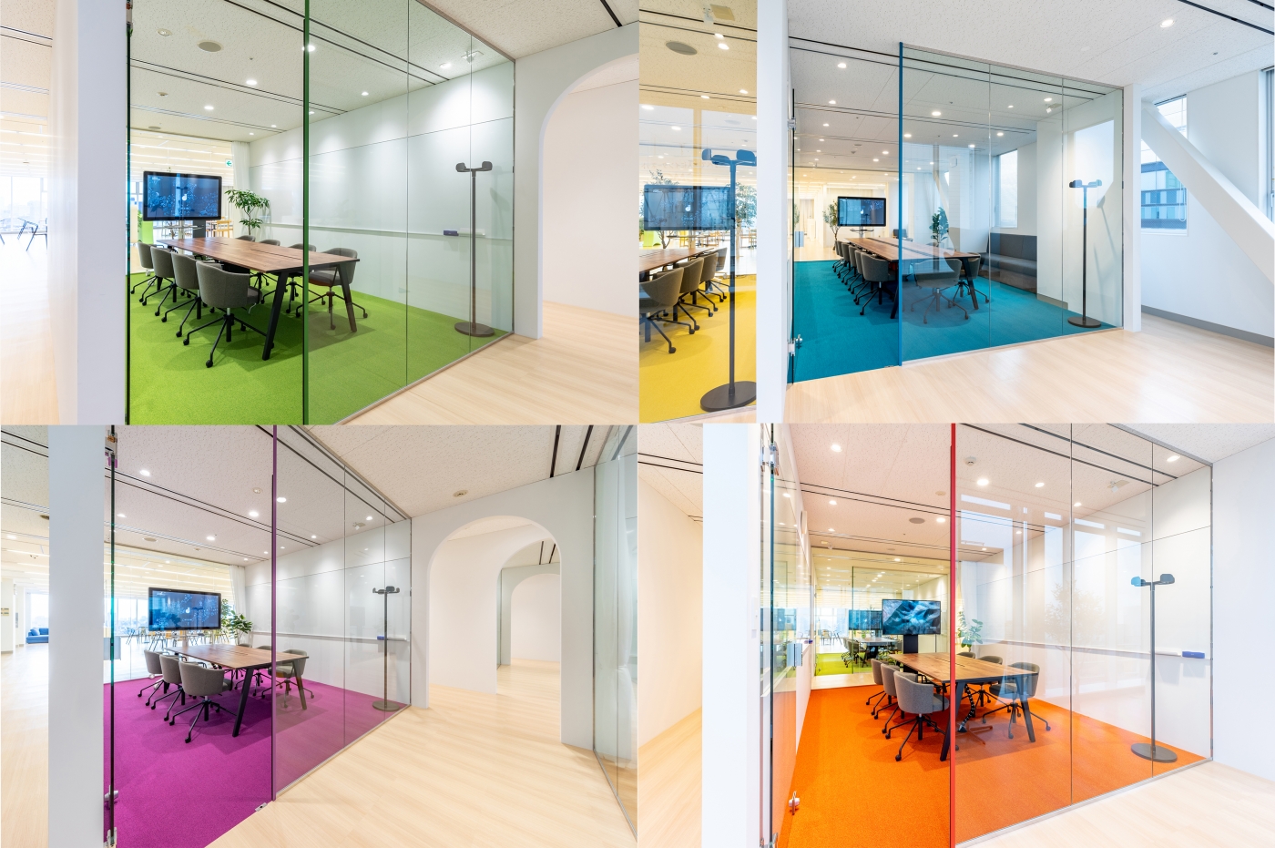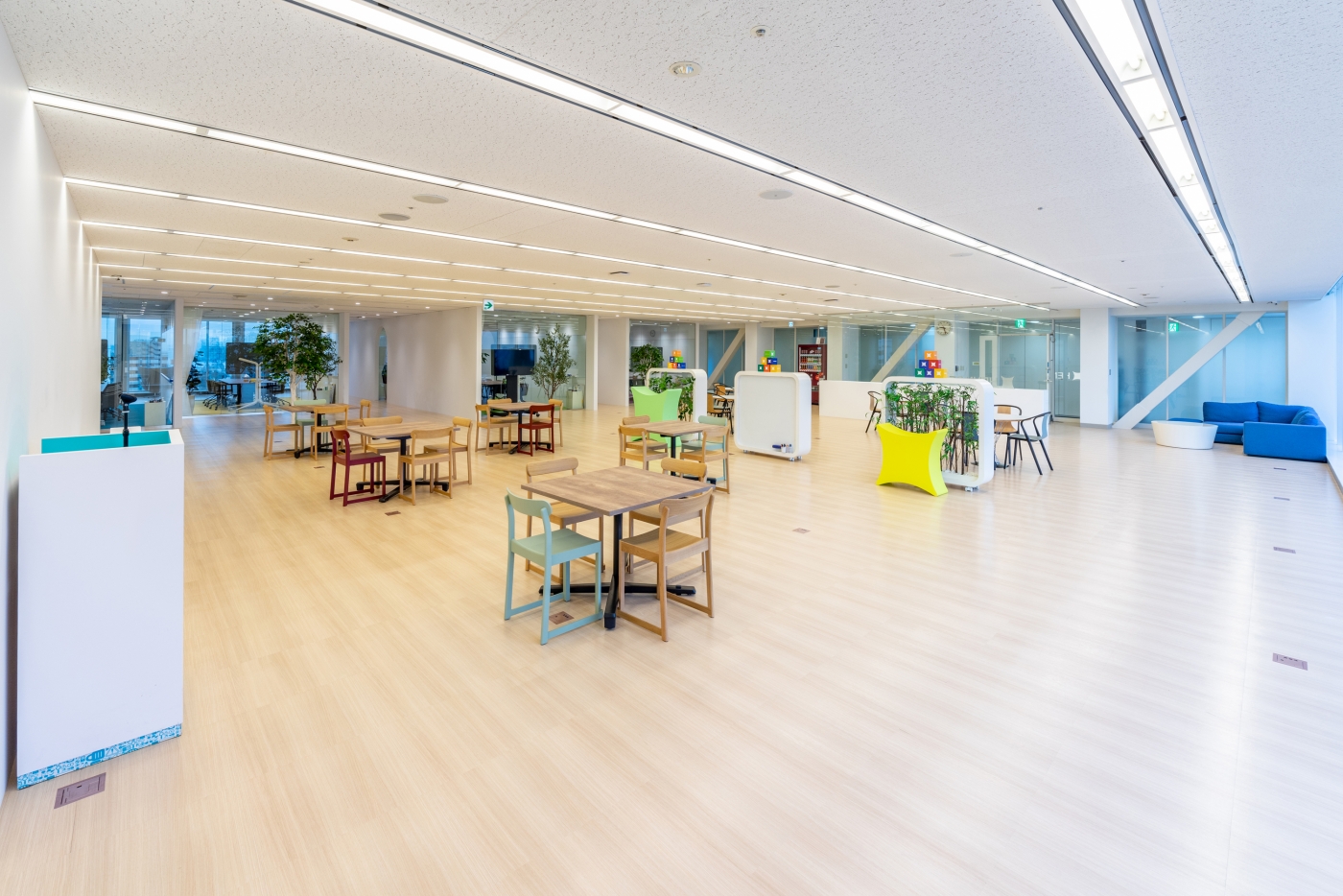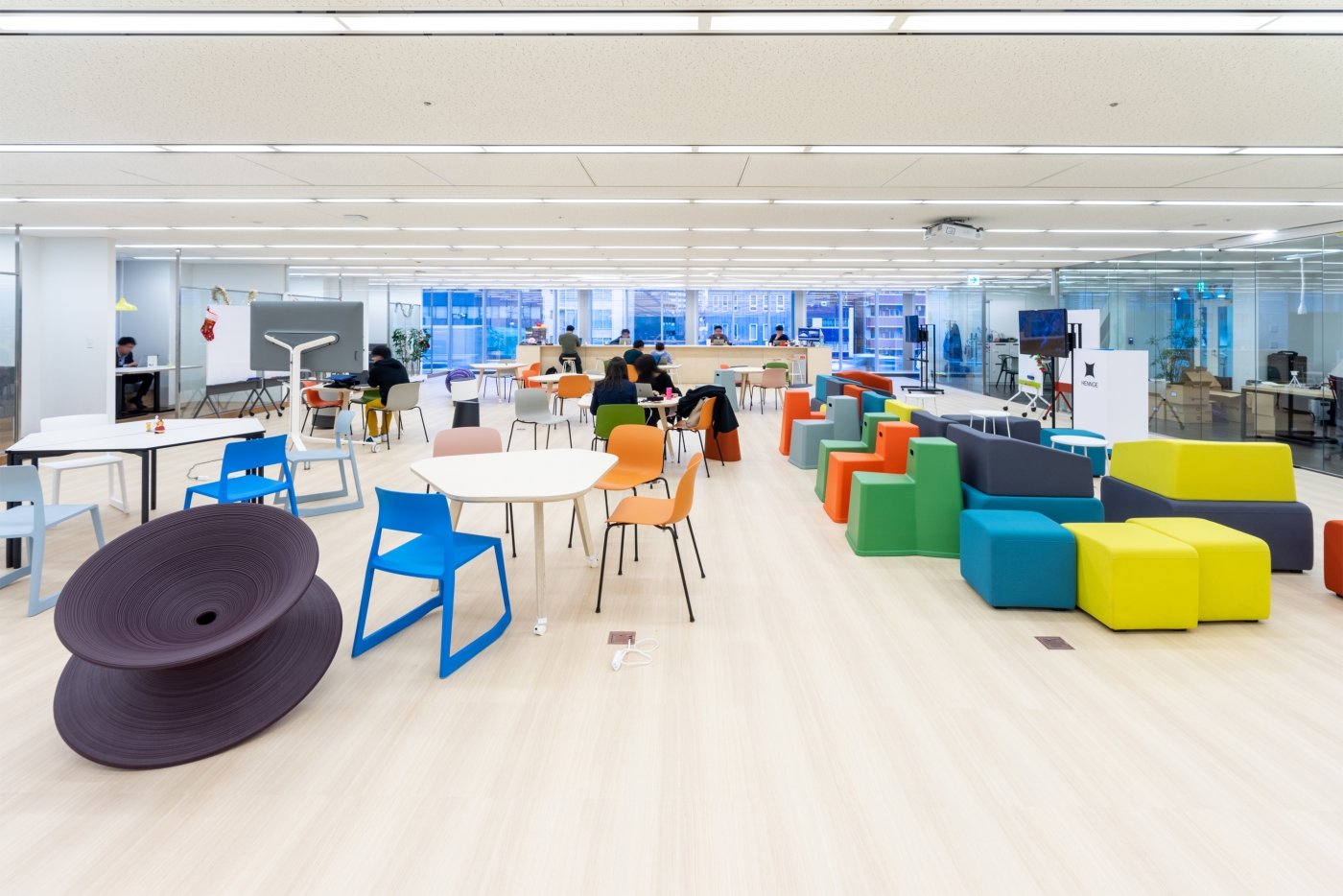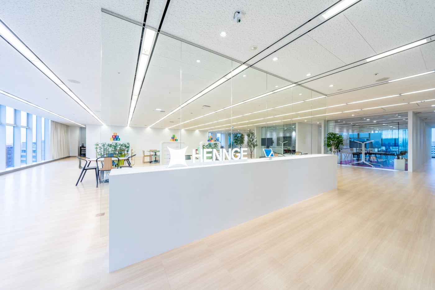 4Fワークスペース、11F来客エリアをお手伝いさせていただきました。イノベーションが起きる場所にするため、ABW(Activity-based working)と完全フリーアドレスを導入し、通路を挟んで左右に全く異なる働き方のできるエリアを作りました。集中エリアには一人ひとりの視線を考慮した造作ビッグテーブルを設置し、コミュニケーションエリアではコラボレーションのしやすさを考えた家具選定をしました。11F来客エリアは各会議室の床の色を変え、楽し気でHENNGE様らしい雰囲気を出すことができました。