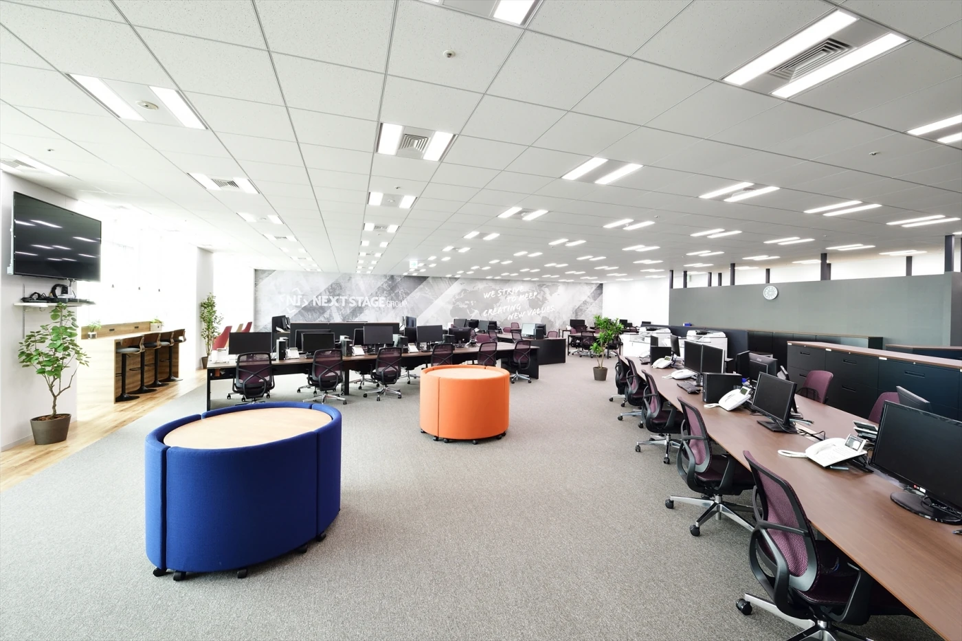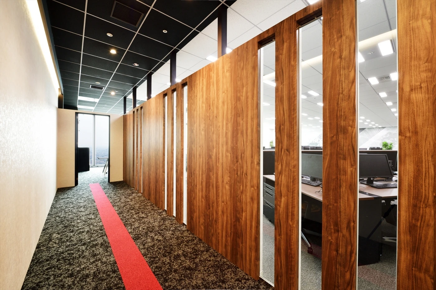 明るく、コミュニケーションが活発な雰囲気で、みんなが楽しく仕事ができる場所にしたいというご要望を頂いておりました。お客様のアイデアもふんだんに取り入れながら、全体的に動きのあるレイアウトとなっています。エントランスから社長室に向かう通路にはガラスを仕込み、来社した方に社内の雰囲気をお伝えできるようにしています。企業理念をデザインに落とし込んだグラフィッククロスをワークスペース内の壁面に施すことでインパクトがあり活気のある印象となりました。また眺望の良い窓面にリフレッシュエリアを設けることで、コミュニケーションを促したり個人でリラックスすることができる空間となりました。