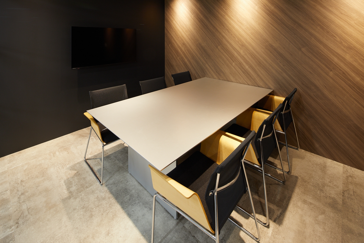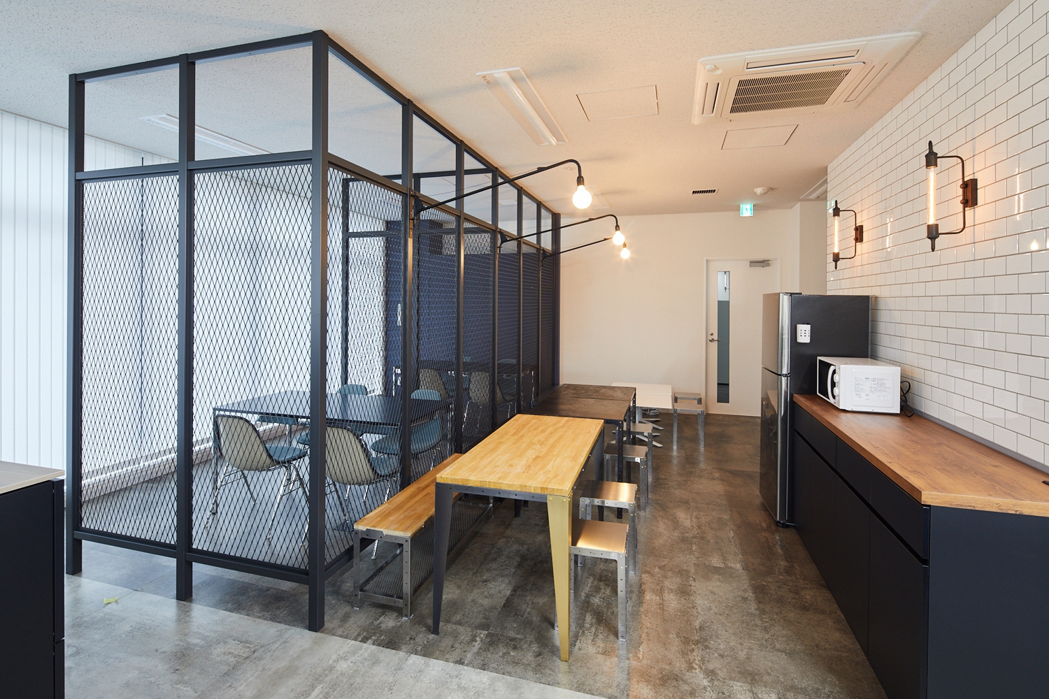 事業拡大を進める中で、今回で3拠点目となるオフィスのお手伝いをさせていただきました。デザインには特にこだわり、無骨なテイストの家具や、タイルの表情、金網を取り入れた間仕切り、スケルトン天井が醸し出す近未来感のあるインダストリアルな雰囲気にまとめ上げました。会議室の1つは、お客様自身で手を加えられるように白の塗装で仕上げ、好きなアレンジができる空間となっています。また、執務デスクをフリーアドレステーブルから、L字のデスクに変更いたしました。これにより1人当たりのスペースも増え、社員の皆さまの働きやすさも更に向上いたしました。