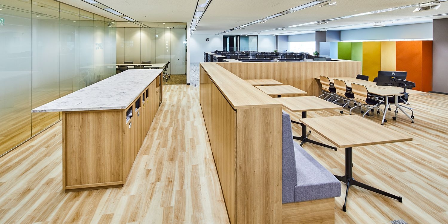 もともとコールセンターと他部署の2フロアで運営していた中、働き方やブランディング向上を見直す中で1フロアに集約。1フロア化したことにより音の問題など業務に支障が出ないように、一方で風通しの良いオフィスになるようレイアウトしました。オフィス中央にはコミュニケーションが自然と生まれるようフリースペースを設け、休憩時間に使用するリフレッシュスペースも、空間を切らないよう腰上からガラスにし一体感を出すデザインにしております。