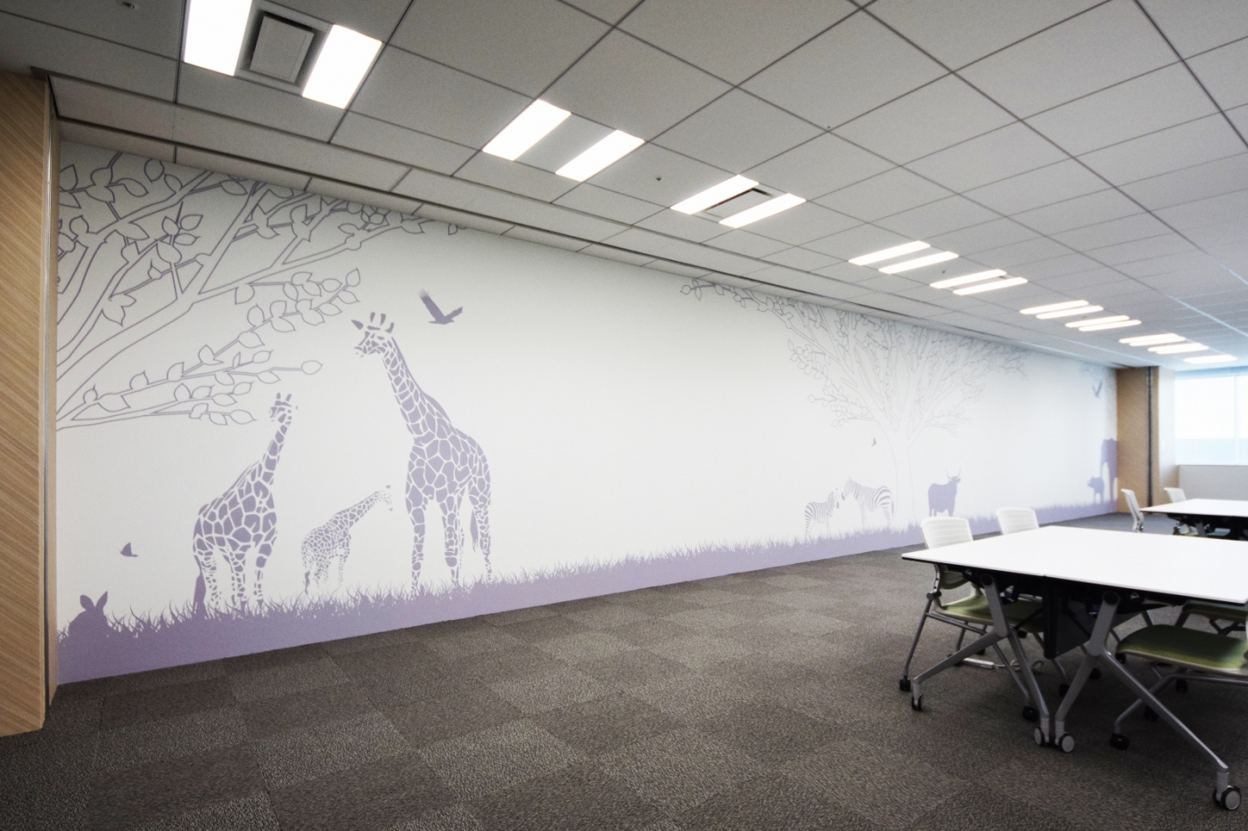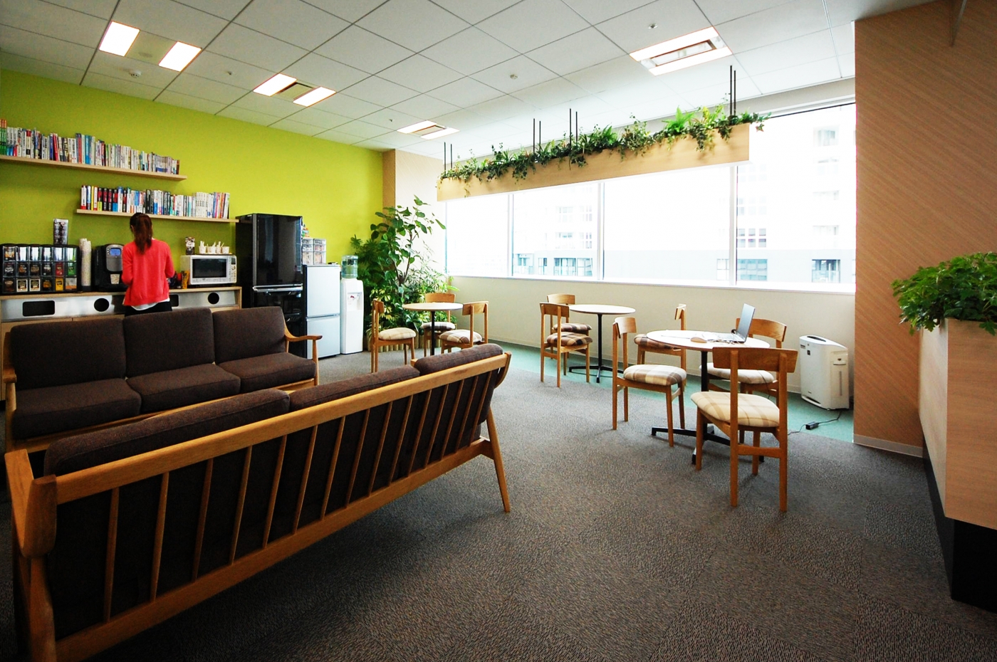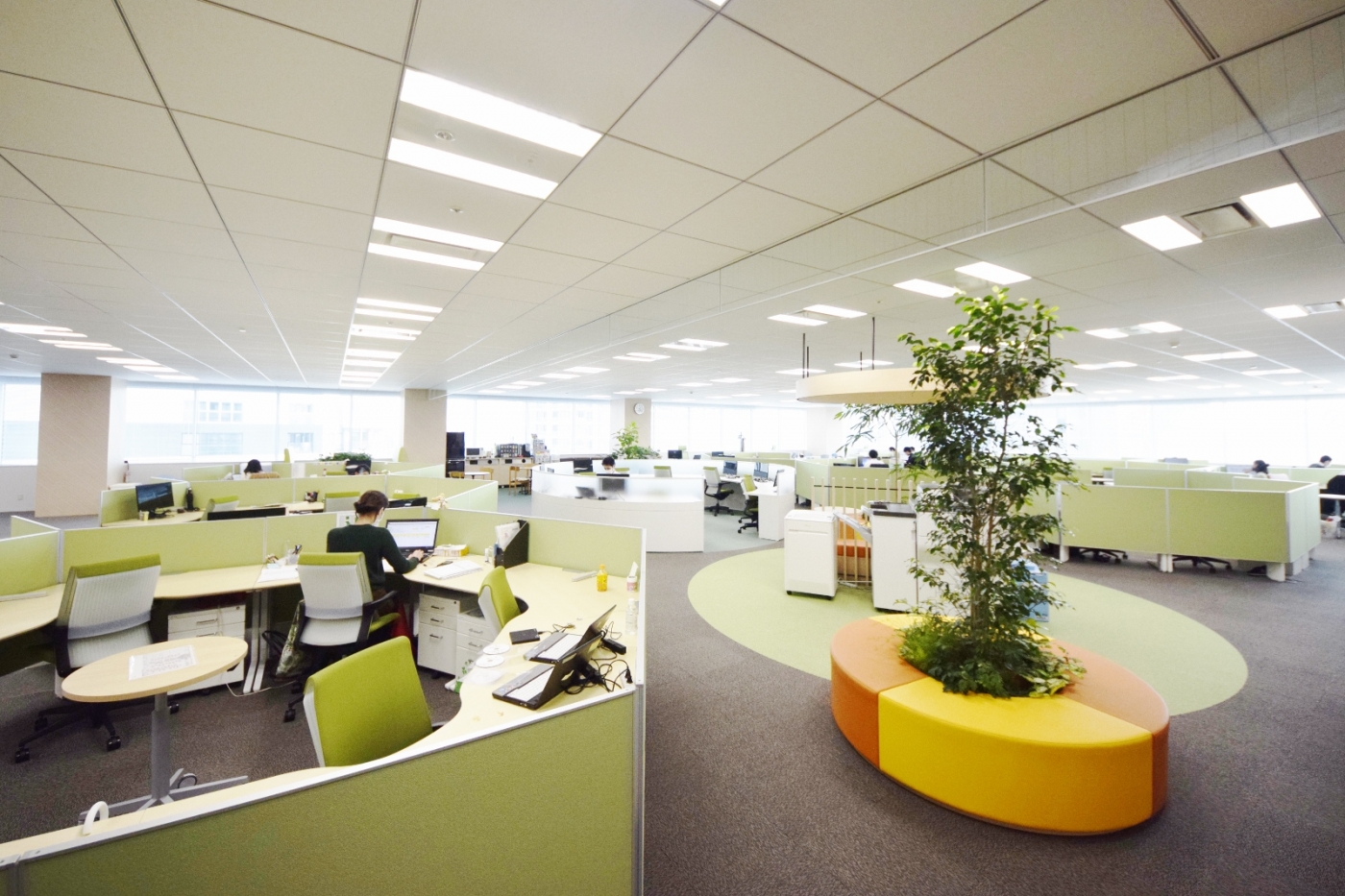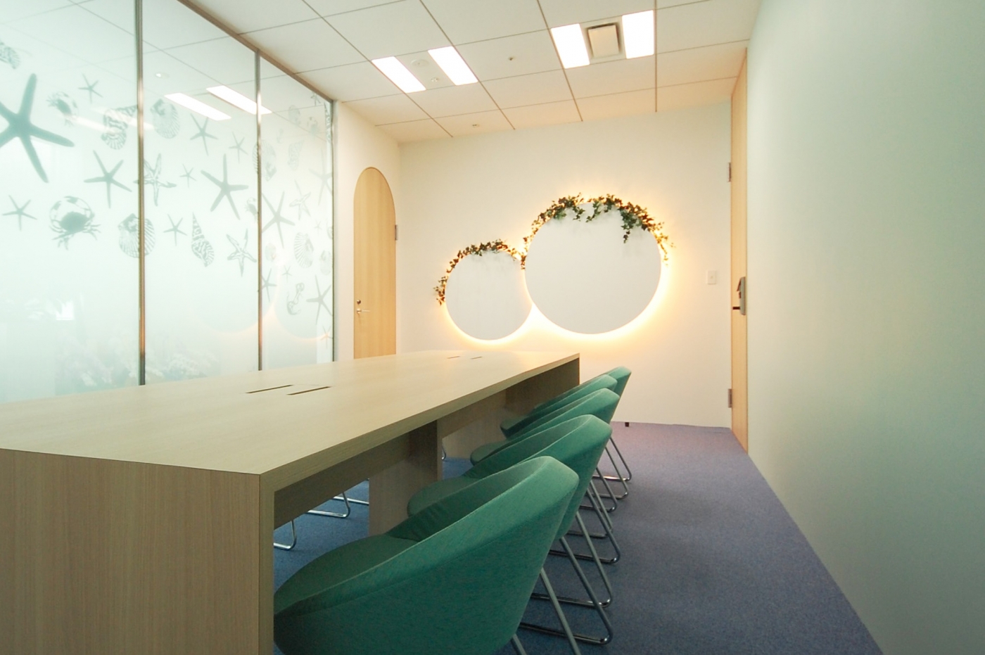 「ネットワークエンジニアのみなさんが、毎日楽しく仕事ができるオフィスを作りたい」というお客様のお声から、横浜という立地も踏まえ「海と山」をイメージした、ヴィスならではのコンセプトオフィスを作りました。エントランスには本物のシェル(貝)を使用、ガラスパーテーションには、シェルやスターフィッシュ、癒しの森などをグラフィックデザインし、オフィス全体で自然を感じられる演出が、随所にちりばめられています。ワークスペースは、デスクトップパネルを採用し、コミュニケーションと集中が共存できる環境を整えました。リフレッシュスペースは、グリーンに囲まれた、ホッと一息つける安らぎの空間となっています。