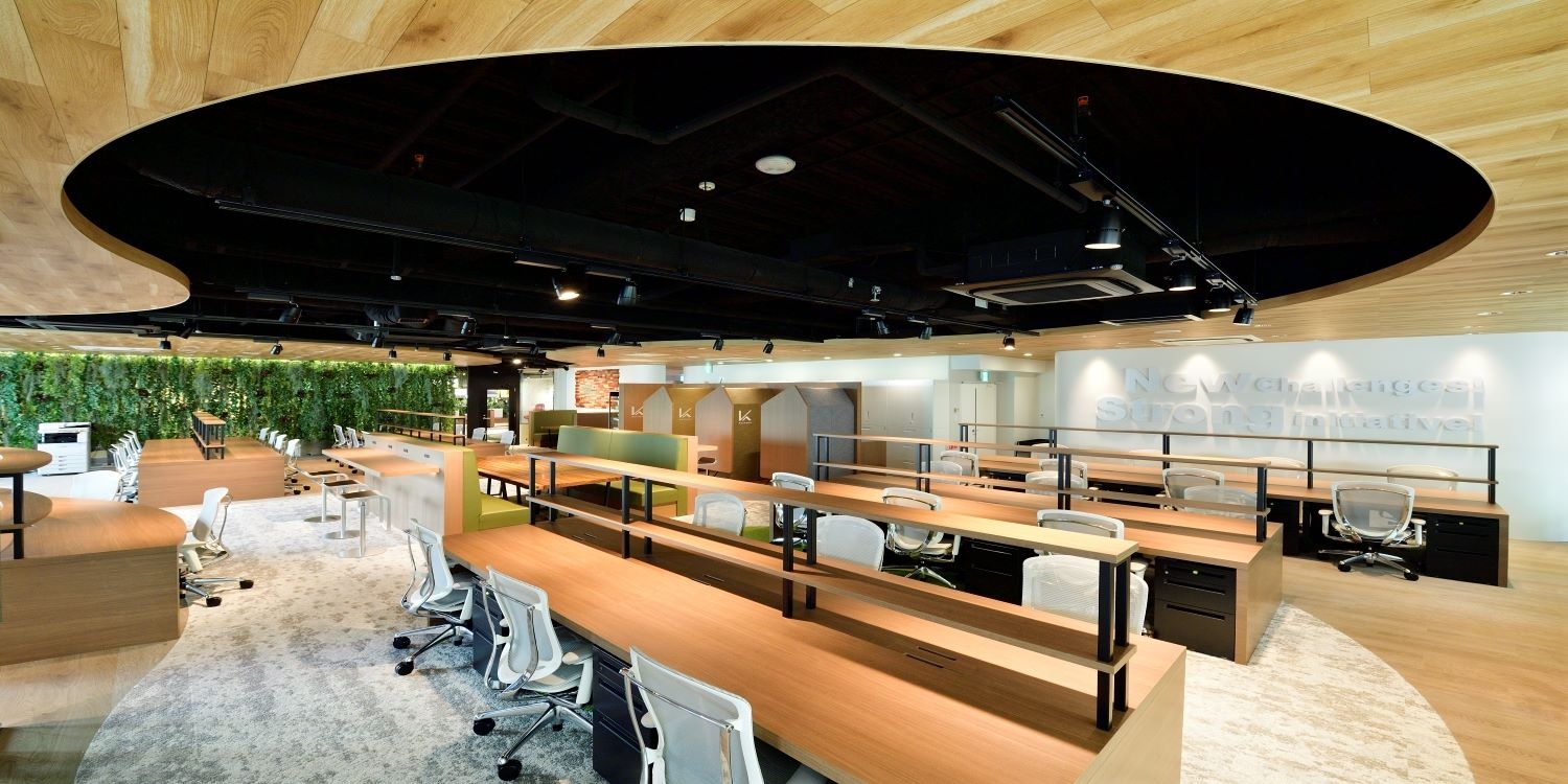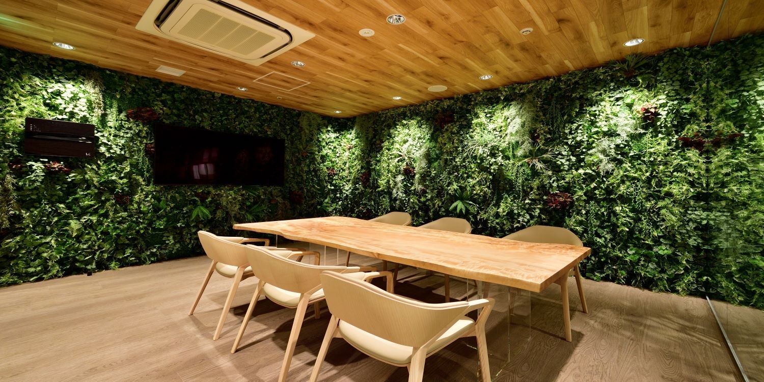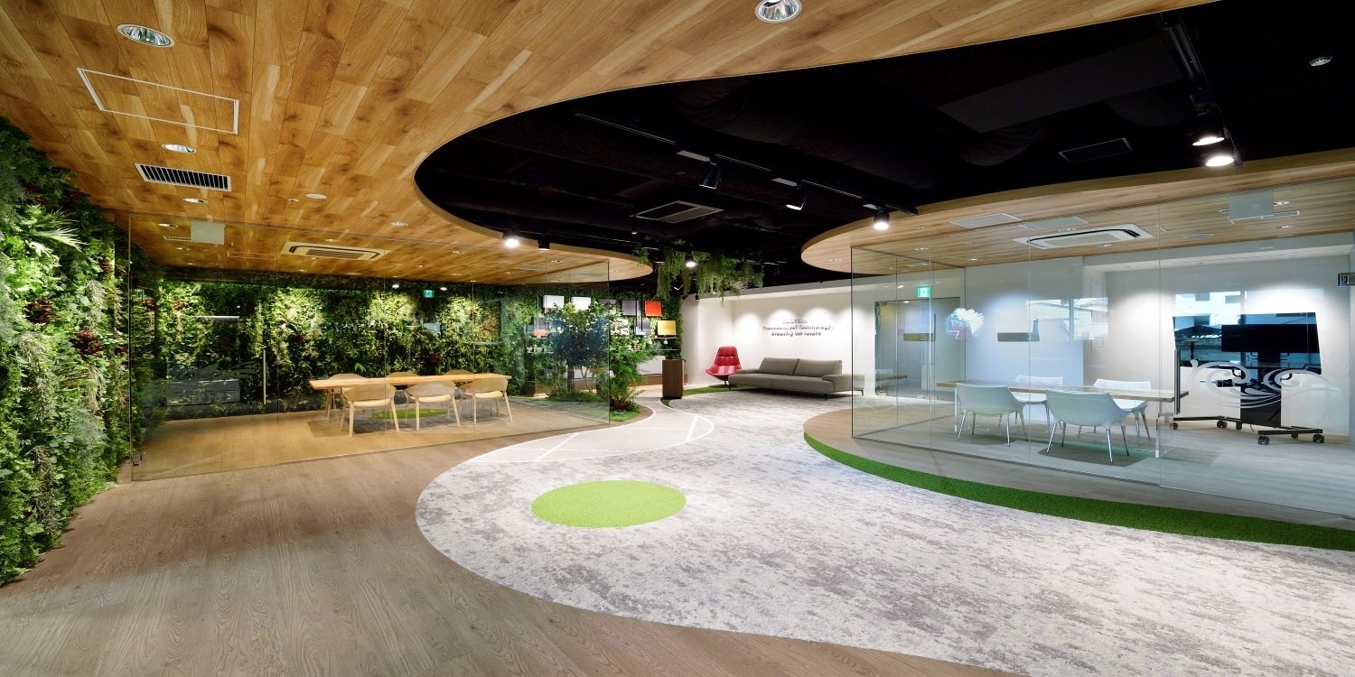 グリーンや木目を通して事業の核である自然や呼吸を感じられるオフィス