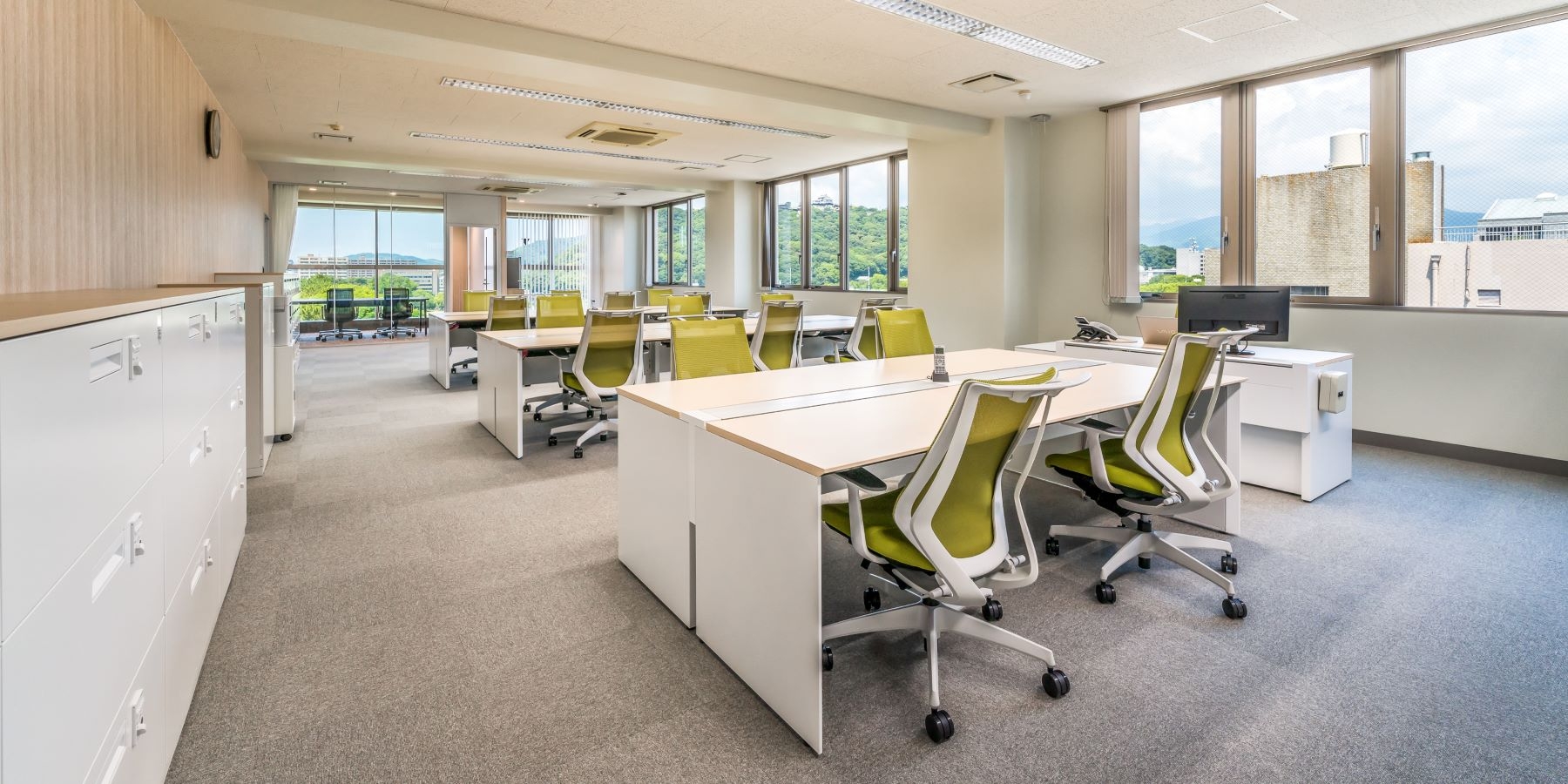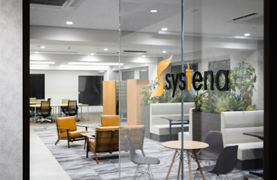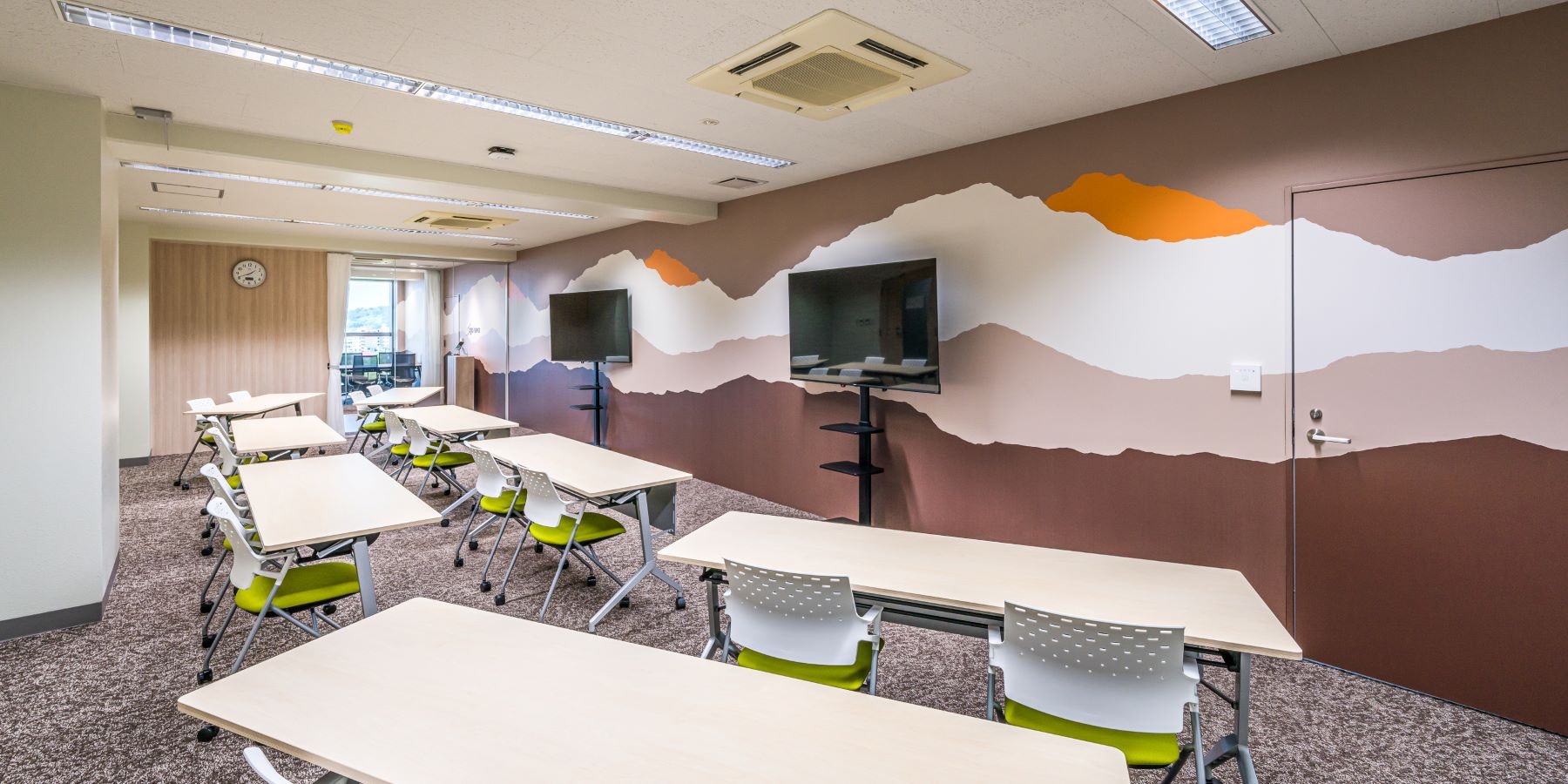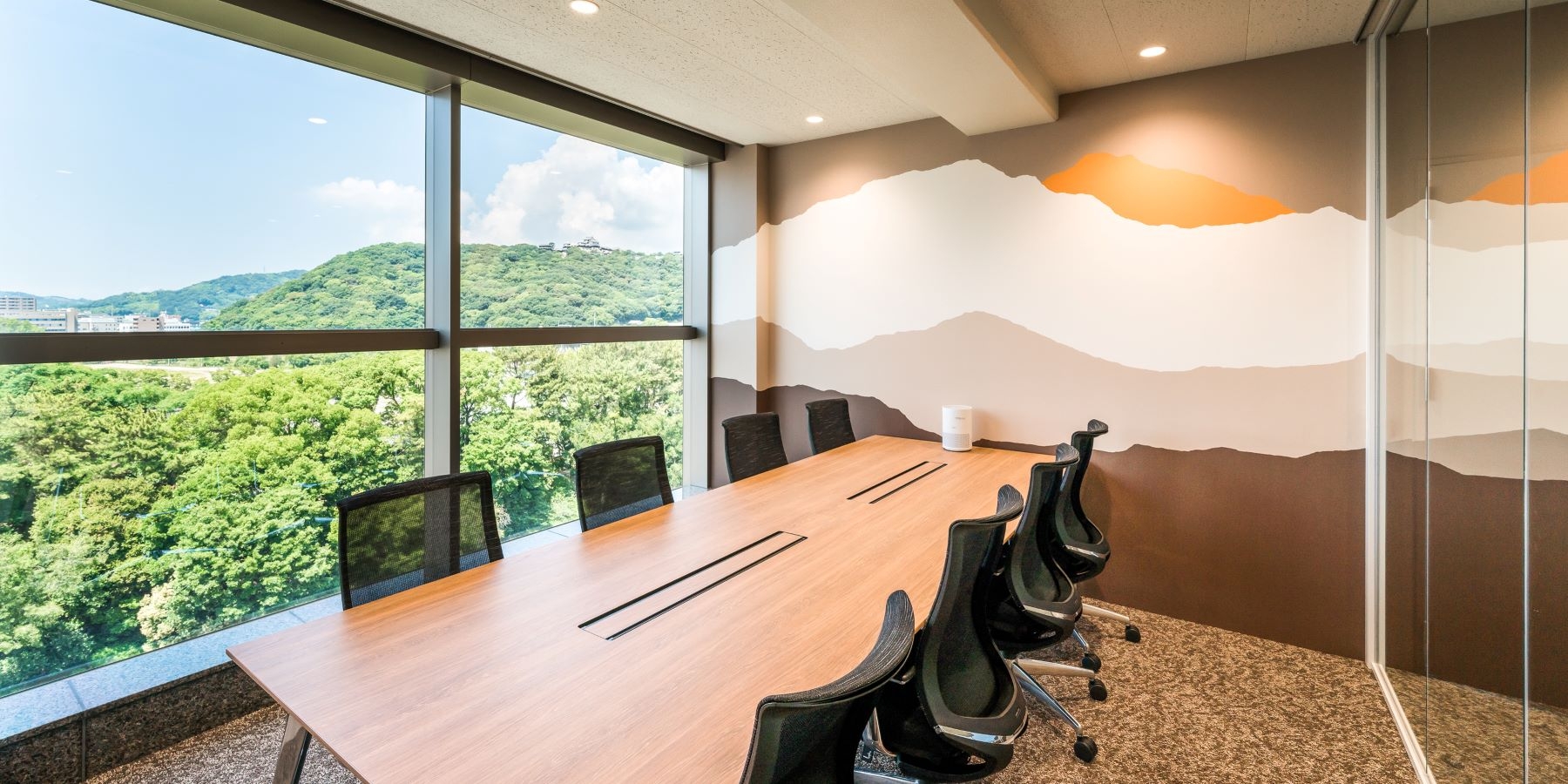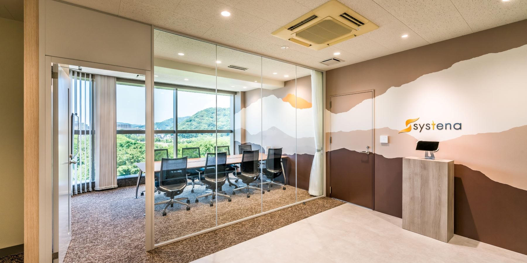 「地域雇用を促す新たなイノベーションラボを創りたい」という想いでプロジェクトをスタートしました。愛媛県と松山市からの誘致ということもあり、地域イメージ×企業イメージを意識した空間づくりをしました。松山城が一望できる非常に良い景観を活かし、エントランスや会議室、セミナールームなどリクルーティングにも活用する来客エリアに「地域融合」を感じられる構成にしました。山々が連なり、ポイントでシステナ様カラーであるオレンジが差し色で入るように見える壁紙をダイナミックに一面貼ることで、「地域融合」を演出しています。会議室から見える景色は壁面一面と外の山々が繋がるよう見え、山頂部には松山城を見ることができます。地域雇用と地域人材の育成に注力されるシステナ様らしい新たな拠点となりました。