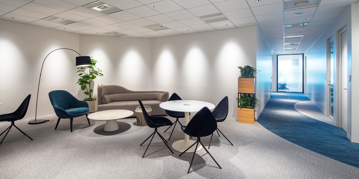 増床に伴うエントランス・会議室等来客エリアのブランディング強化、及び出社率を抑えている現状をふまえて、オフィスの使い方の再構築を行いました。来客エリアは、テクノプログループ様の事業内容「社会における人材の流れを活性化する」を表現するべく、Stream(流れ)をモチーフに流線型のデザインを施し、カラートーンを統一して品格を感じられる設えとしました。ワークエリアは、この機会にフリーアドレス制を新たに導入。落ち着いて業務ができる島型レイアウトはそのままに、対面席をなくしてパーソナルスペースを大幅に広げ、アクリルパネルも用いてより安心して出社できる環境を作りました。また、グリーンをあしらったフリーエリアや気軽に集まれる立ちミーティングスペース、テレブース等を配し、コミュニケーション、集中しての作業等、思い思いに利用しやすい空間を構築しました。
