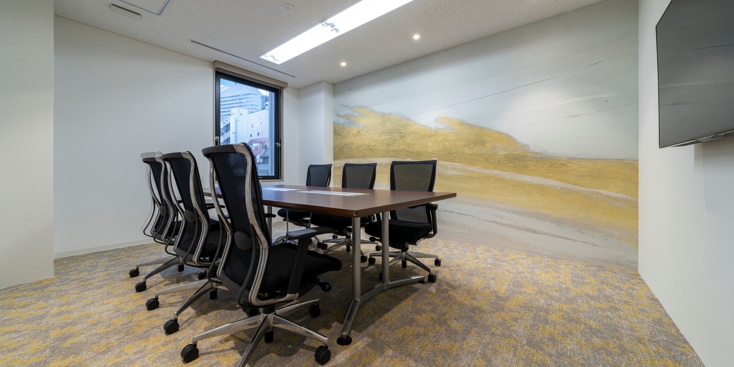 DESIGN デザイン オフィス移転に際し、ABWの導入、クリエイティブな発想ができる空間に重点を置いた新しいワークスペースをご要望頂きました。以前のオフィスから引き続き「和」のエッセンスを意匠として施し、会議室の壁面にはそれぞれ「和」が感じられるデザインを選定しました。間仕切りにはガラスを使用することで開放感が感じられるとともに、エントランスからもワークスペースが見えるため、常に整頓する意識を持つこともできます。ワークスペースのフリーアドレスエリアは大きくスペースを取ることで一体感を出し、床の貼り分けや家具の配置で働き方に応じてエリアが選べるよう工夫しました。人数の増減に合わせて動かしやすい家具にて構築しています。会社としての更なる挑戦を支える環境づくりを意識し、開放的で自由度が高い空間を構成しました。 ※ABWとは……Activity Based Working の略。最適な場所や時間を自ら選んで働くワークスタイルのこと。