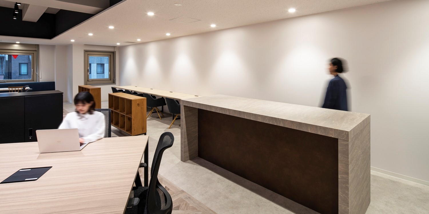 外壁リニューアル(https://designers-office.jp/work/page/index.php?id=932)と合わせて、オフィスフロアのリノベーションを行いました。1フロア100坪程度の区画を50坪程度2区画のセットアップオフィス(内装デザインし、すぐに入居できるオフィス)としました。一つの企業として統率力を上げるフェーズの企業の入居を想定し、50坪としています。ビルの立地や想定される入居企業の特徴も考慮してモルタルやウッドタイルなどをバランスよく配置し、温かさがあるスッキリとした印象のオフィスに仕上げました。