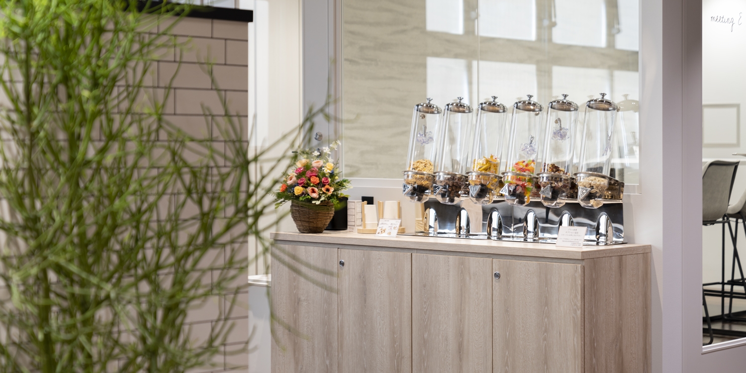 自社ビルの倉庫として使用していたフロアをコワーキングスペース『HATA-LARK』としてリニューアルしたプロジェクト。フロア内には1名から使用できるレンタルオフィス、コワーキングエリア、会議室、キッチンスタジオなど様々なユーザーの使用を想定したスペースを複数設けました。ビジネスユーザーの使用だけでなく、地域に根ざした場所になるようキッチンスタジオも企画、設計しています。室内にはグリーンを各所に設置しており、リラックスして自分らしく働くことができるとともにユーザーの自然発生的なコミュニケーションを促します。会議室はアクセントクロスで空間に遊び心を取り入れ、明るい雰囲気に。廊下は元々あった床の風合いを活かし、部分的にモルタル以外の素材を用いて空間にリズムをつけました。シェアオフィスのサインには真鍮色のものを用い、特別感を出しています。お店のコンセプトをオフィスデザインで形にしたほか、今回はシンボルロゴやカラーリング、看板、マットのデザインまで一緒に製作しており、デザインの統一を通してブランディング構築をお手伝いしました。