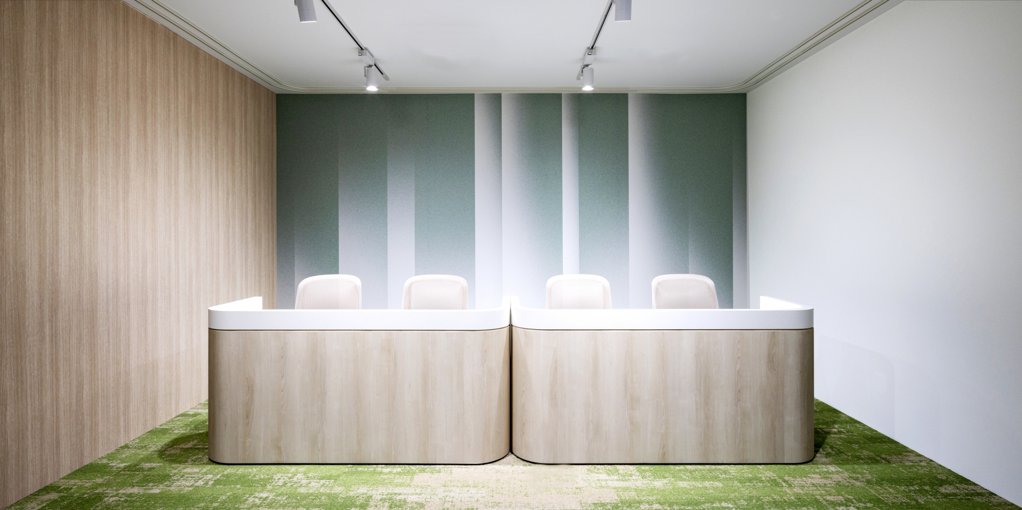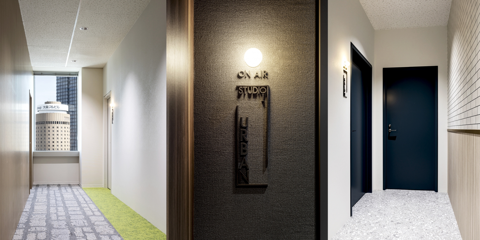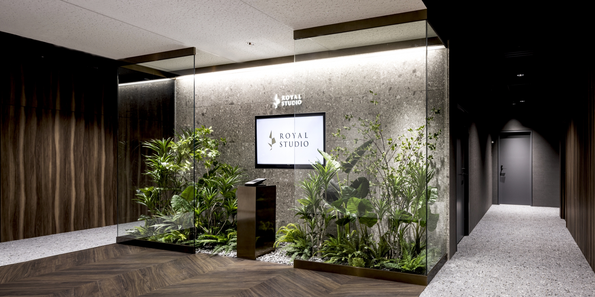 「ROYAL STUDIO」というコンセプトの下、“西日本一の伝説”となることを目指しスタジオをデザインしました。ラグジュアリーなスタジオエントランスは、上品で洗練された雰囲気に仕上げました。ブロンズをキーカラーとして、ガラスのフレームや床の見切りなども同色で収め、中央の植栽を引き立たせています。4つのスタジオはそれぞれ「アーバン」「スクエア」「ガーデン」「サロン」とテーマを設け、テーマに合わせたデザインや家具などオリジナリティのある設えとしました。用途に合わせて選べる構成となっています。床・壁の意匠と壁面にアクセントを設けてスタジオ感を演出したほか、使い勝手も考慮したオリジナルのテーブルを用意しました。執務室側のエントランスは上質で明るい印象を持つデザインとしました。自社製品であるテレキューブ展示スペースとしての機能も有しており、来訪した方が楽しみながら商品を体感できる環境を創りました。独創的で印象に残り、遊び心のある空間となりました。