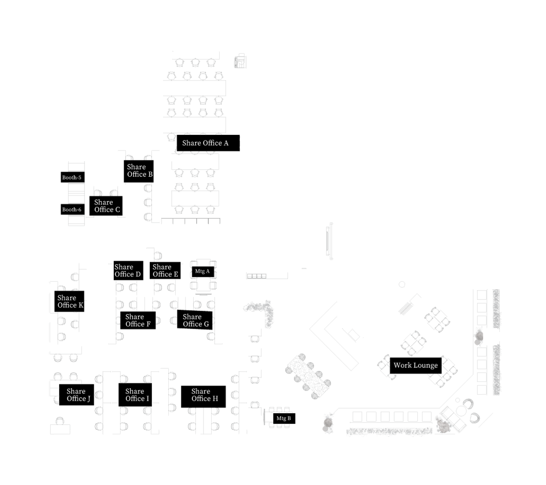 個室とは別に開放的なシェアラウンジで作業が可能。入居者が共働する空間として、企業の垣根を超えたコミュニケーションを生みだしています。偶然の出逢いがつながりとなり、ビジネスの可能性を広げてくれます。