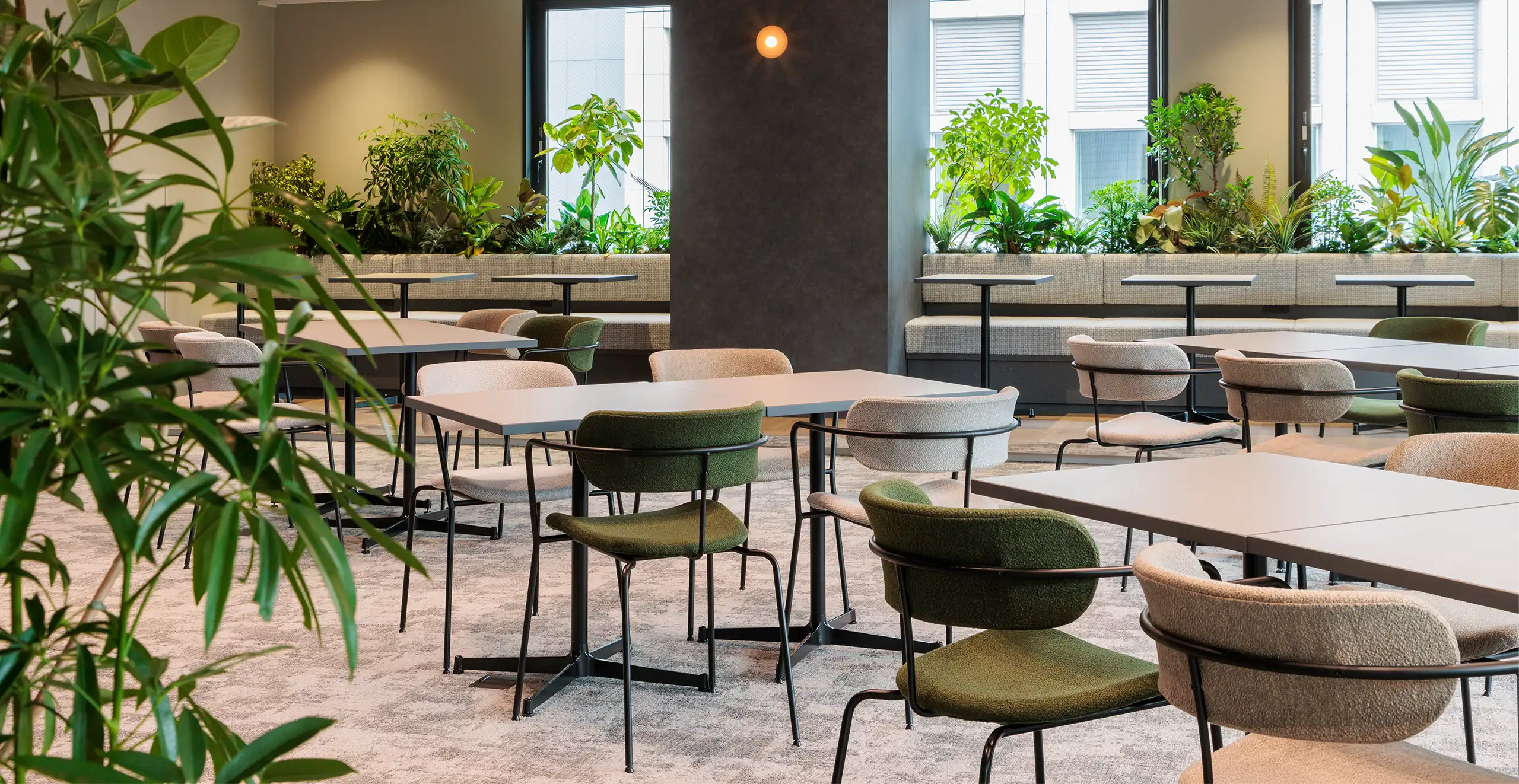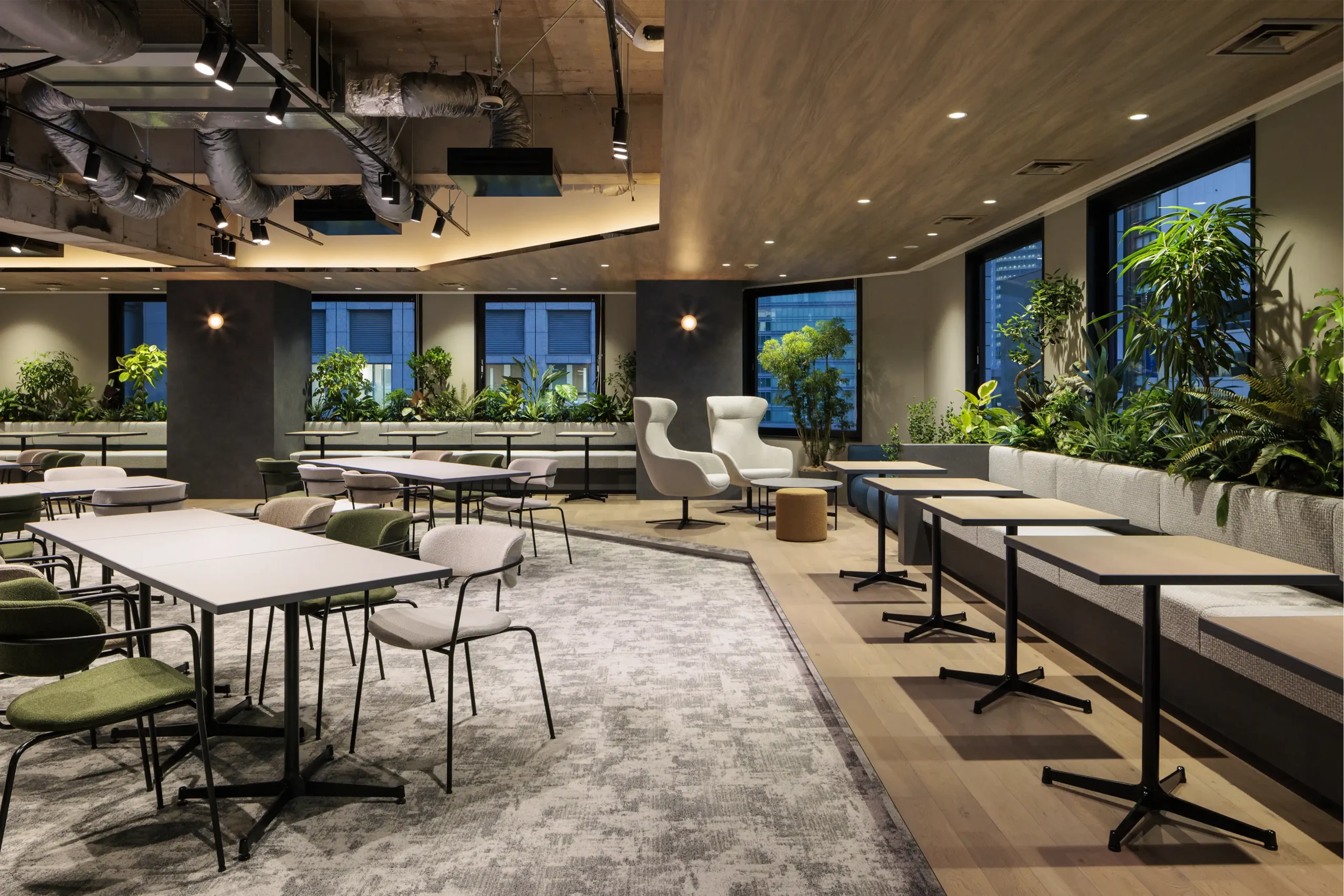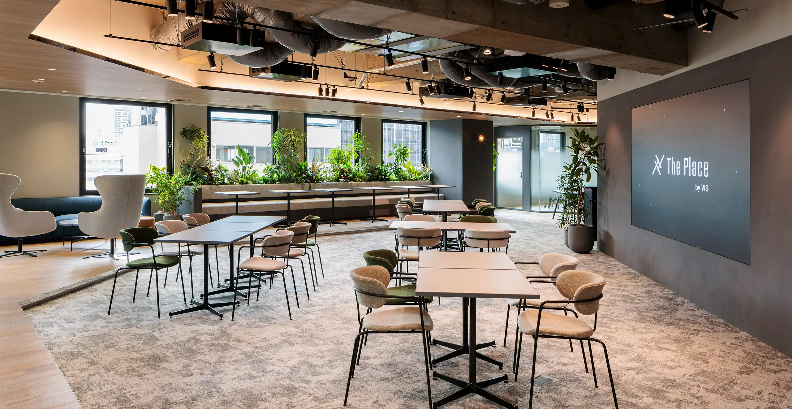 The Place 名古屋では、シェアオフィス3部屋とワークラウンジを完備。 オンライン会議に対応した完全個室や集中ブースなどもあり、ハイブリッドワークが実現できます。 ワークラウンジには大型LEDモニターも設置しており …