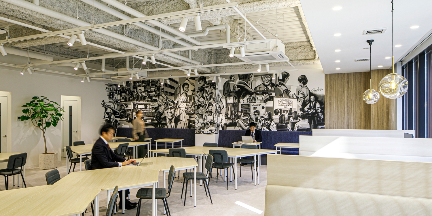 約2年に及ぶ本社ビル建て替えプロジェクトでした。1935年に創業、1946年から現地で営業しており、前回の本社ビル完成から53年ぶりのリニューアルとなりました。全体コンセプトは、培ってきた歴史を未来に繋ぐという思いをこめて、「BOND(繋ぐ)」としました。建築段階から6フロアに重なるビルの構想を重ね、来客エリア・多目的スペース・自社エリアとバリエーション豊かな構成となっています。2階はパートナー企業様も働いていただけるよう自由なレイアウトができる家具を選定し、3階は社員同士の交流が生まれるよう人の止まり木となる場所を点在させました。ホワイトを基調とした空間の中に、随所にコーポレートカラーのブルーを取り入れています。インパクトのあるアートは、2階にはこれまでの歴史のモチーフを、1階には未来へ向かうイメージのグラフィックを描き、80年を超える歴史あるオザワ科学様が未来に向かってイノベーションする様子を表現しました。人が集まり繋がることで未来を拓いていくオフィスとなりました。