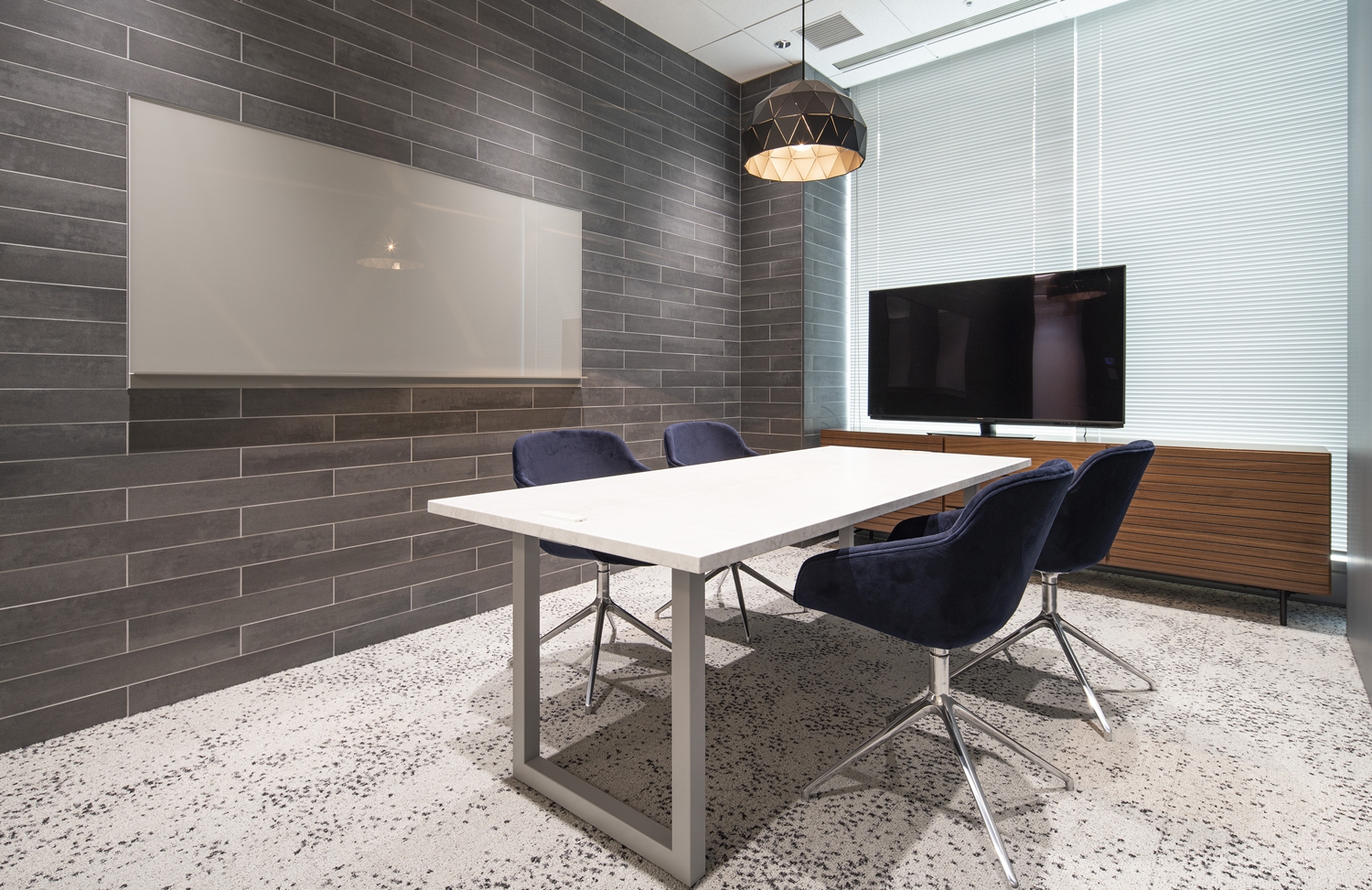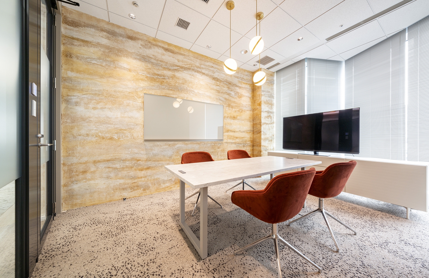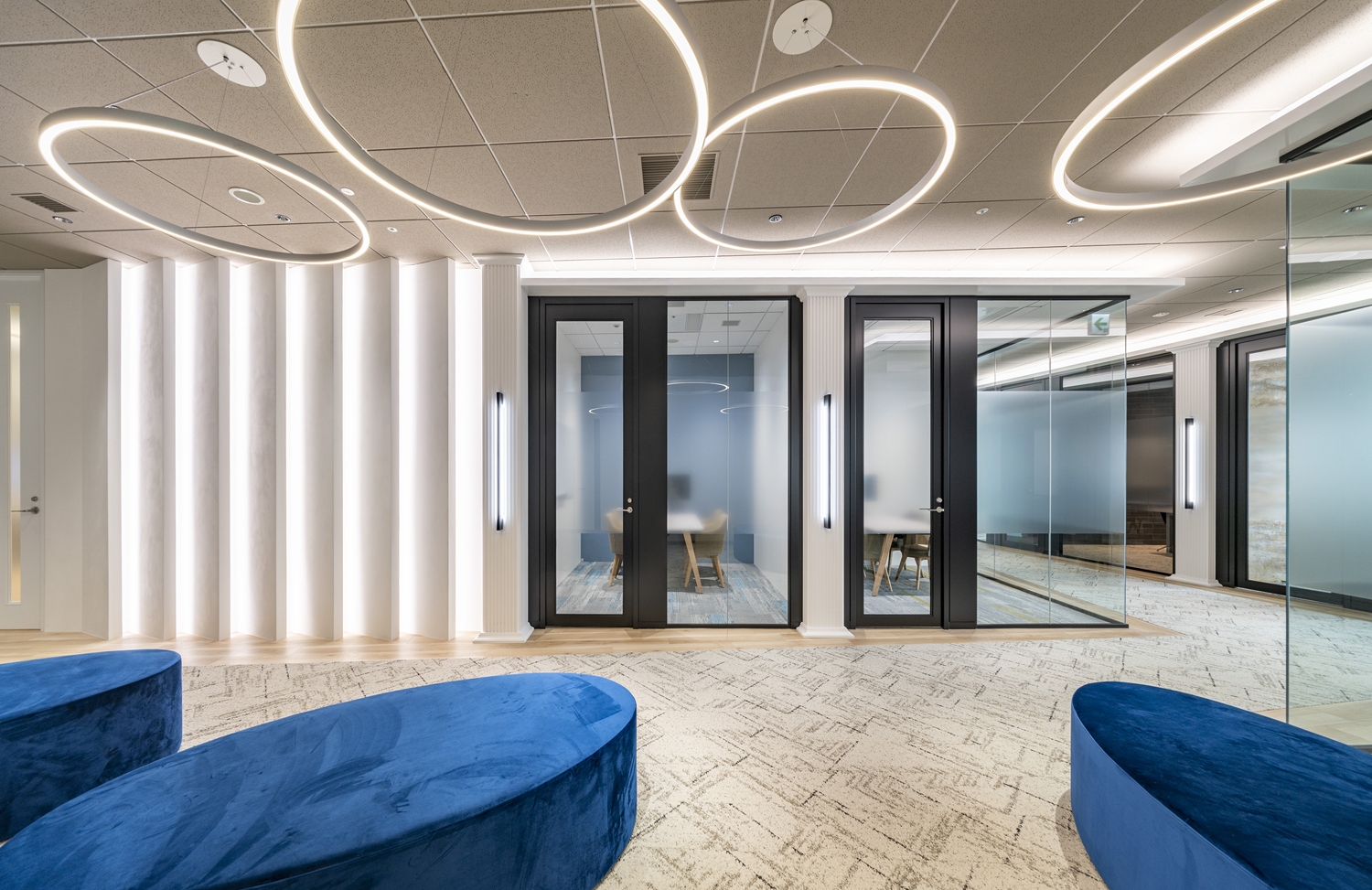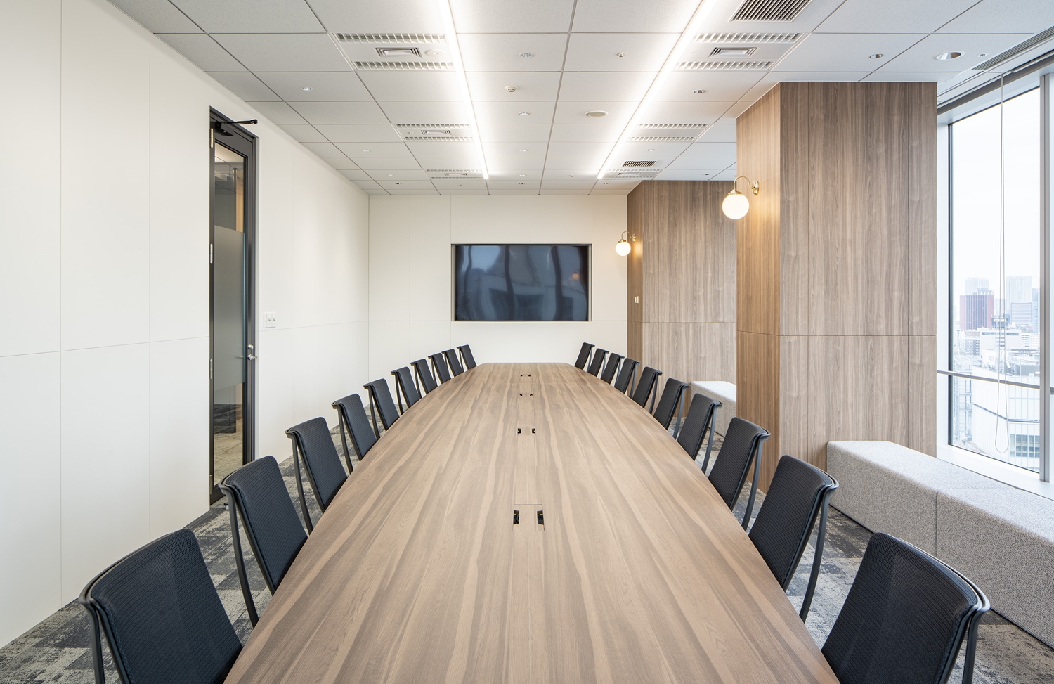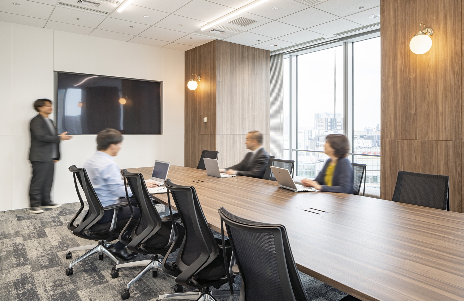 ハイブリッドワークに対応したはたらき方のアップデートとともに、フロアを統一してコミュニケーション活性化を目的としたオフィス移転プロジェクトでした。コンセプトは『NEO MODERN』とし、お客様の「急成長」と事業の特性上重要である「信頼」を、「未来を駆け抜ける」「格式の高さ」という2つの要素に置き換え、クラシックと近未来を融合させたデザインを空間全体に落とし込みました。部門を超えたコミュニケーションを大切にされており、社員の仲の良さが特徴の会社様ですので、一体感を育むワークプレイスを目指してデザインしています。ワークスペースは一部フリーアドレスを導入し、動線も広く確保することでオフィス内でコミュニケーションが生まれる仕組みを施しました。さらにサイネージも導入し、情報共有も促進させます。エントランスは、来社したお客様の信頼を得られるよう品のある空間を意識しました。会議室は各部屋のカラーリングを変えポップで明るい雰囲気を演出し、楽しんで選ぶことができます。特にVIPルームは、特殊塗装やサンフッド(木のシート)、タイルといったマテリアルを採用し、本物ならではの高級感を演出しました。