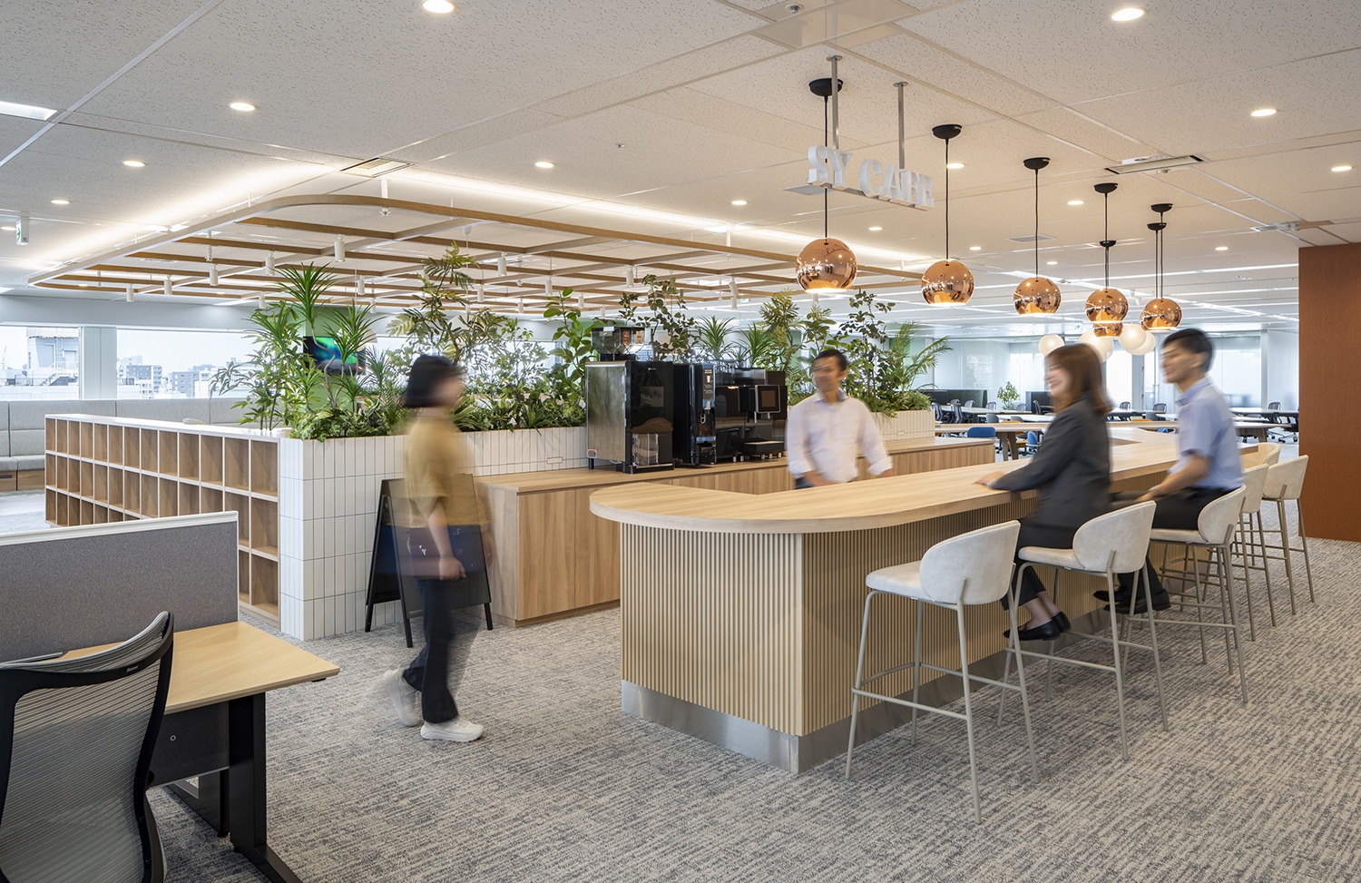 今回、デザイン設計に入る前のプログラミングの段階で、『WORK DESIGN PLATFORM』を活用しサーベイを実施。社風や雰囲気・ビジョンへ高い共感を持ちながら働いている人が多く、働くことへの意欲が高いことがわかりました。ここから、社員の皆さまが自発的に働いている感覚をより高めることができれば、自ら働き方を考えることにもつながり、働くことへの意欲をさらに向上させられると考え、働く場所として幅広い選択肢をもてるようなオフィスをデザインしました。天井のデザインや床上げで緩やかに仕切りながら、ワンフロアが見渡せる空間の中に、集中して働くための固定席を残しつつ、自由で動きのある座席も多く用意した折衷空間を設計。また、社内外含めてコミュニケーションを活性化させていくために、エントランスすぐの場所に来訪者を迎え入れるカウンターを設置したり、大々的なカフェテリアをオフィスの中核に配置したりするなど、交流の輪が広がるようなレイアウトをつくりだしています。全体的な雰囲気としては、窓からの光を効果的に取り込み、開放的で明るく活発な空間を演出。そのほかにも、色の特性を活用して、ワークスペースは事務的な作業にならないスペースとなるように工夫も施しています。