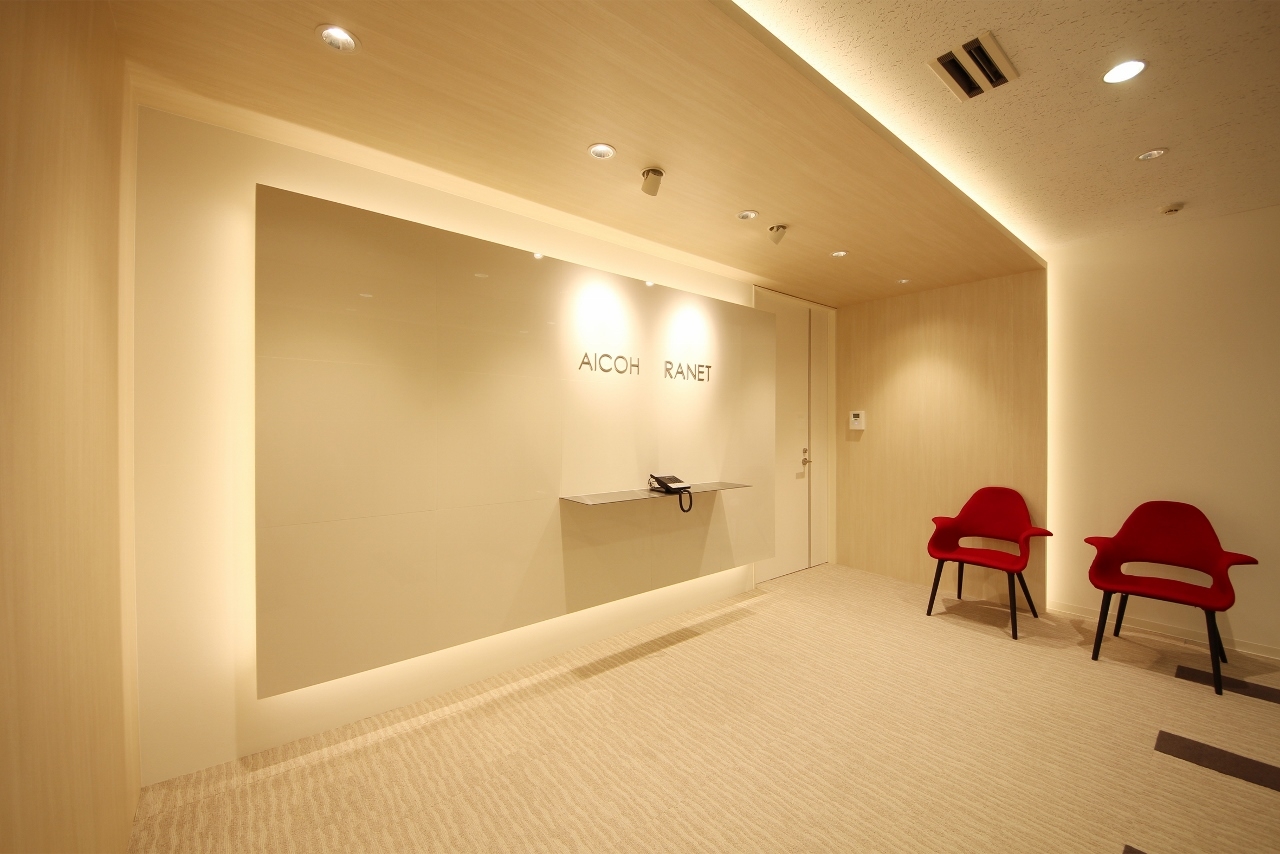 エレベーターを降りると、目の前に広々と広がるエントランス。そこは来訪されるお客様をあたたかく迎え入れる、最高のおもてなしオフィスです。ビルの共用部とエントランスがガラスで間仕切られている特徴を最大限に活かし、床材をつなげることによって、エントランスをより広く感じられるデザインにしました。淡い木目と白く輝く磁器タイルで、清潔感・透明感・高級感を演出。さらに天井にはひかりのゲートのデザインを加えて、特別感が感じられる空間になっています。役員室や会議室にはガラスの窓を採用し、空間に広がりを持たせると共にワークスペースの中まで採光が取れるようにし、明るい広々としたワークスペースを設計しました。