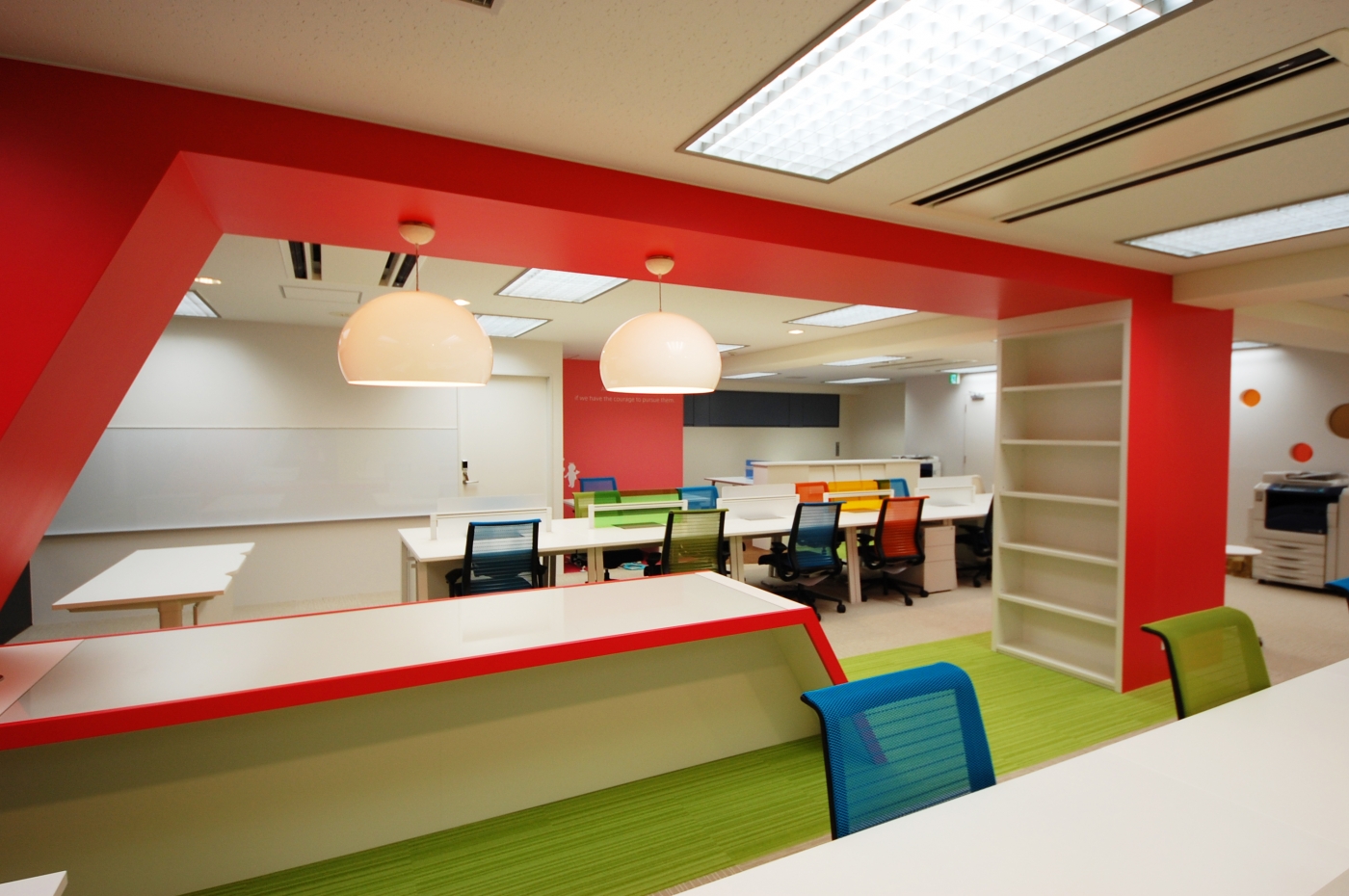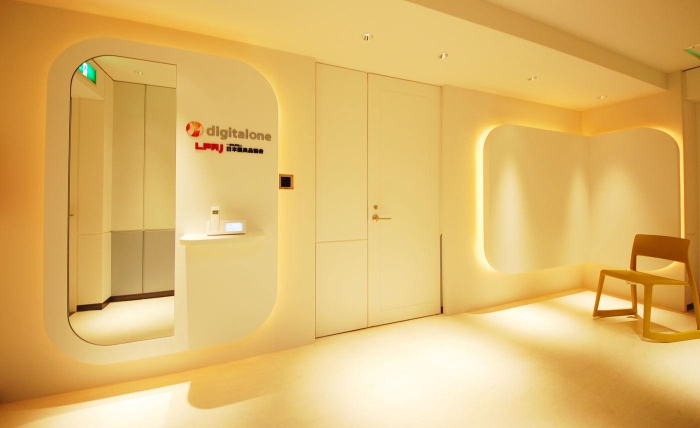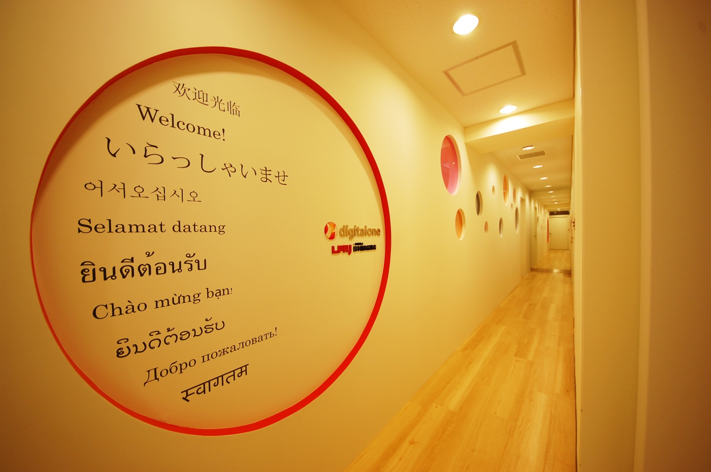 コンセプトはdiagonal(斜めの,対角的な)。 普通に考えたら邪魔になる斜めの大きな柱をうまく活用できるプランをというオーダーでした。この柱を、シンボルとなる打ち合わせテーブルと一体化して見えるようにご提案。斜めのデザインをそのまま活かしました。新ロゴマークが映えるように、白を基調としたエントランス。アジアにビジネス領域を広げているデジタルワンのホスピタリティーを表現するために、各国の「いらっしゃいませ」を壁面に配置しました。オリジナルのインフォメーションボードやワークステーションも一新し、メンバーたちの業務効率向上のためのイノベーティブなオフィスが誕生しました。