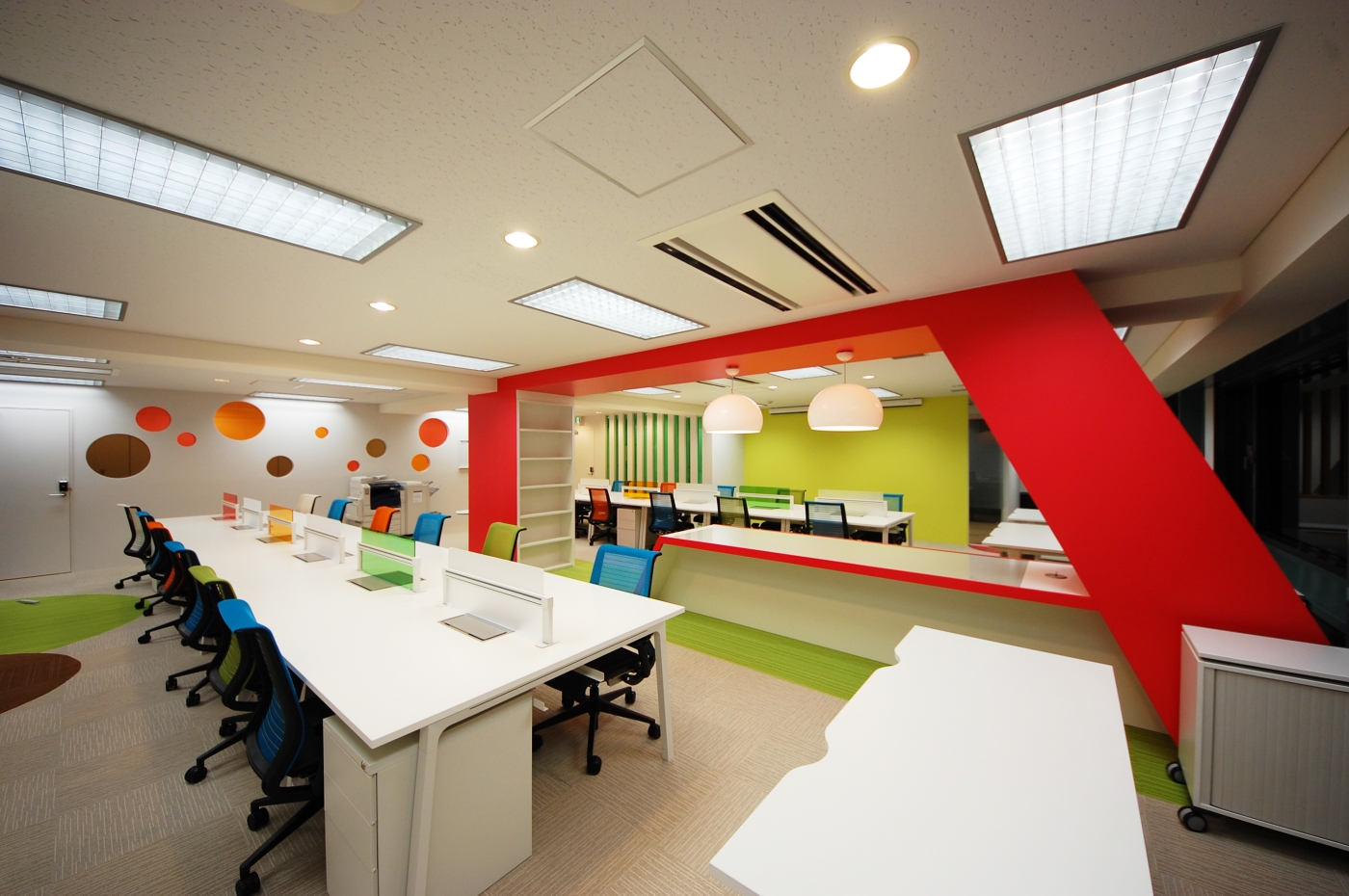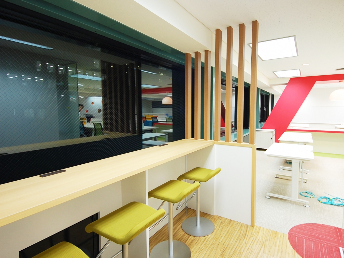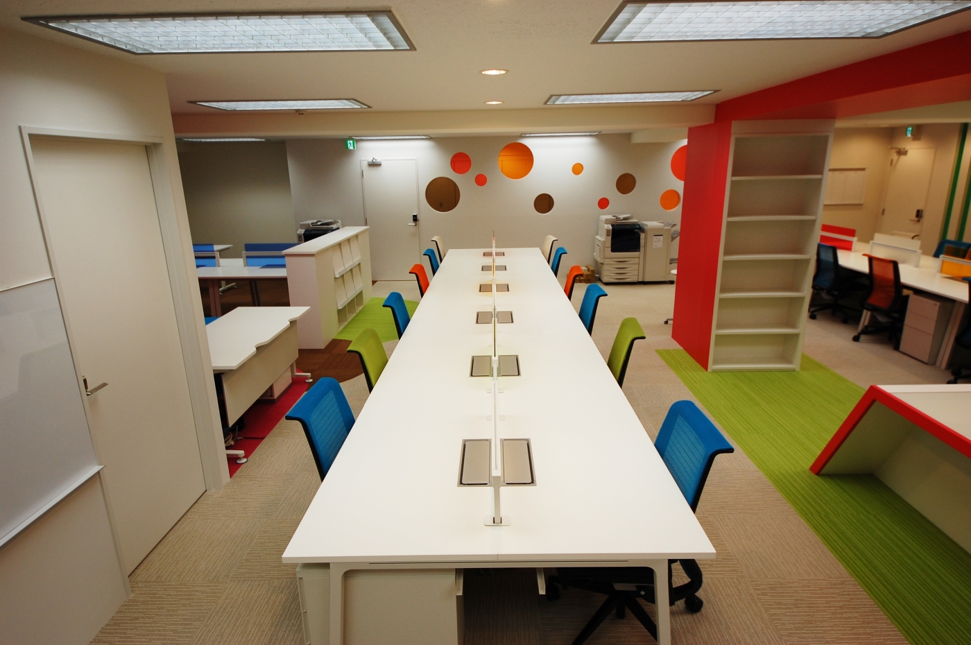 コンセプトはdiagonal(斜めの,対角的な)。 普通に考えたら邪魔になる斜めの大きな柱をうまく活用できるプランをというオーダーでした。この柱を、シンボルとなる打ち合わせテーブルと一体化して見えるようにご提案。斜めのデザインをそのまま活かしました。新ロゴマークが映えるように、白を基調としたエントランス。アジアにビジネス領域を広げているデジタルワンのホスピタリティーを表現するために、各国の「いらっしゃいませ」を壁面に配置しました。オリジナルのインフォメーションボードやワークステーションも一新し、メンバーたちの業務効率向上のためのイノベーティブなオフィスが誕生しました。