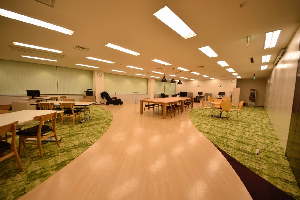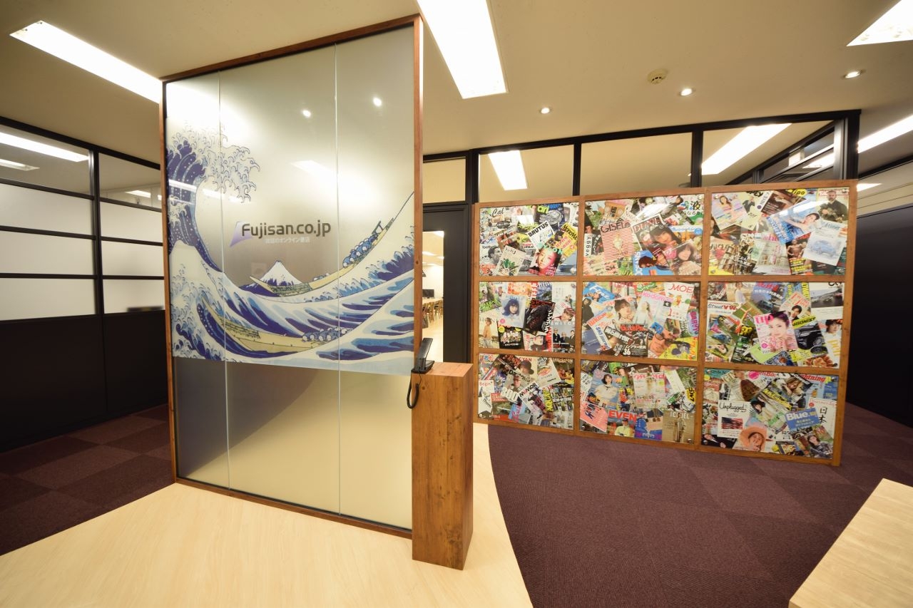 「富士山」や「マガジン」という企業ブランディングを表現するオフィスを目指しました。エントランスでは北斎の富士山をガラスシートに貼り、富士山の裾野が広がるのと同じように奥へ繋がる期待感を表現しました。取り扱う雑誌のコラージュを毎年変えることができるディスプレイウォールを造り、お客様と共に創り上げるエントランスとなりました。同ビル内での増床ということで、『マルシェ』というコンセプトをもとに、人々が行き交う場となるようコワーキングエリアを設け、ビッグテーブルやファミレスブースなどを取り入れることで新しい働き方のご提案をさせて頂きました。