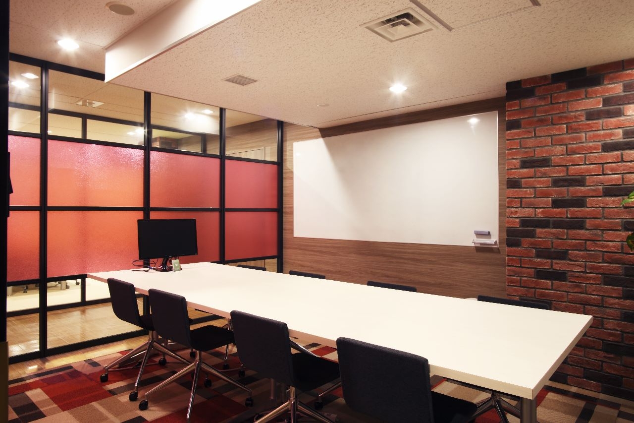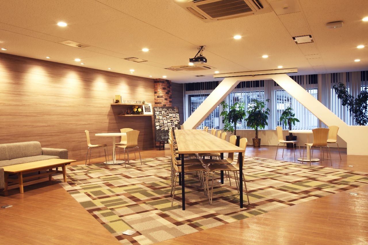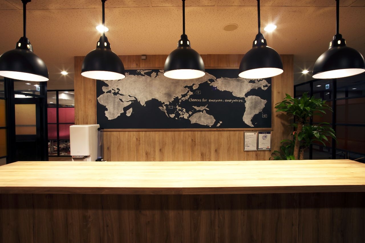 コンセプトは「どこでもドア」。レアジョブ様のオンライン英会話を通じて、全ての人が一歩踏み出すことができるようにとコンセプトを設定しました。エントランスはあえてシンプルにレアジョブ様をイメージできる空間に。10部屋ある会議室にはそれぞれ5大陸5大洋をイメージし、扉、床、壁のデザインを変更。スタンドミーティングをできる場所も作りました。ワークスペース内には社内打ち合わせ用のファミレス席や、集中して作業のできる窓際カウンターを設置。存在感のある柱はコーポレートカラーに変更し、さらにパントリーにレアジョブ様のサインをかたどったハイテーブルを設置することで社内のブランディングを高めることができました。