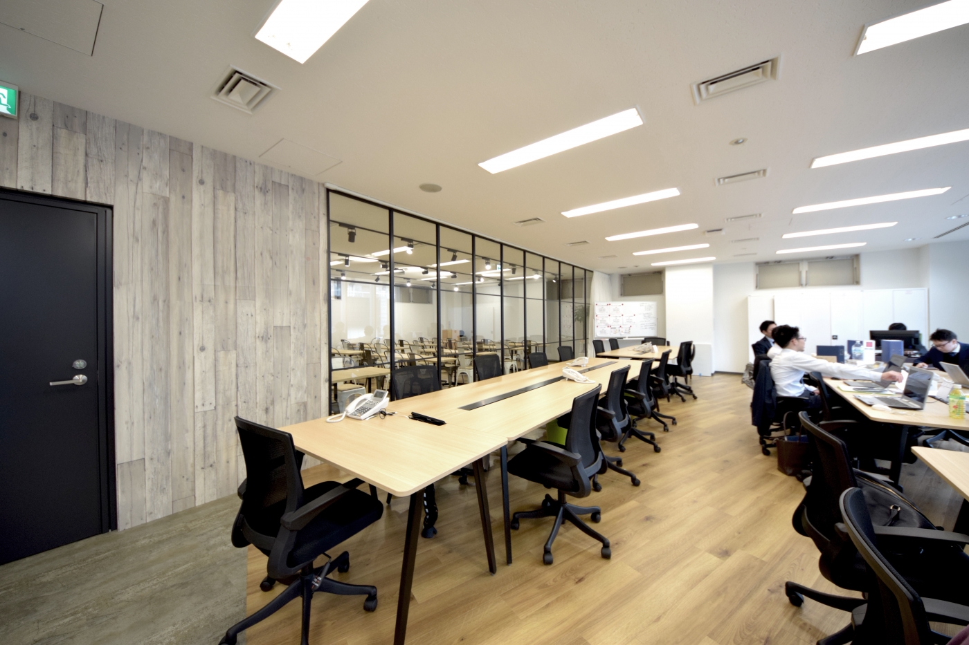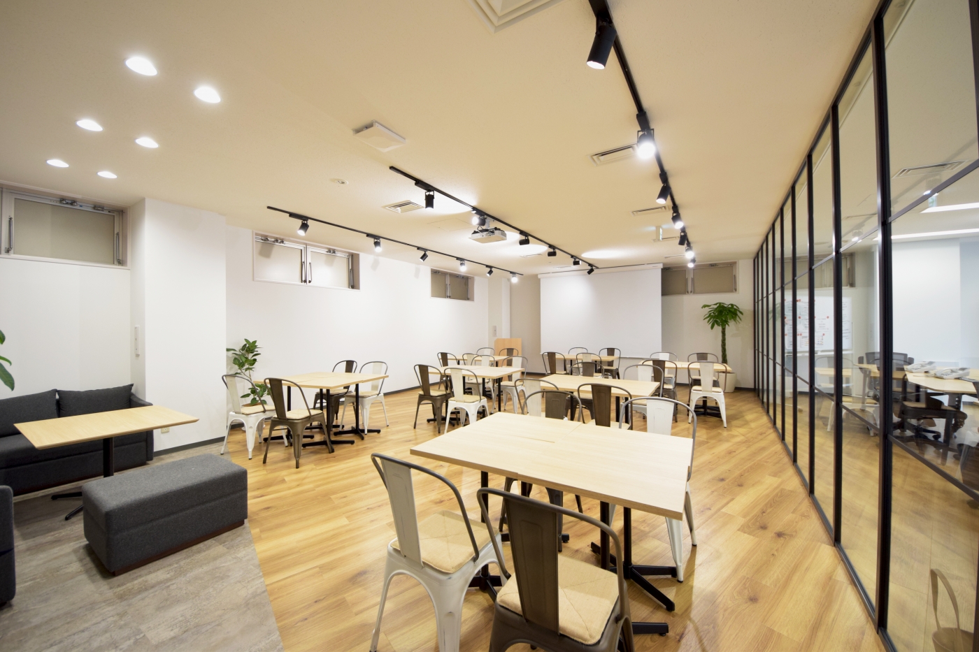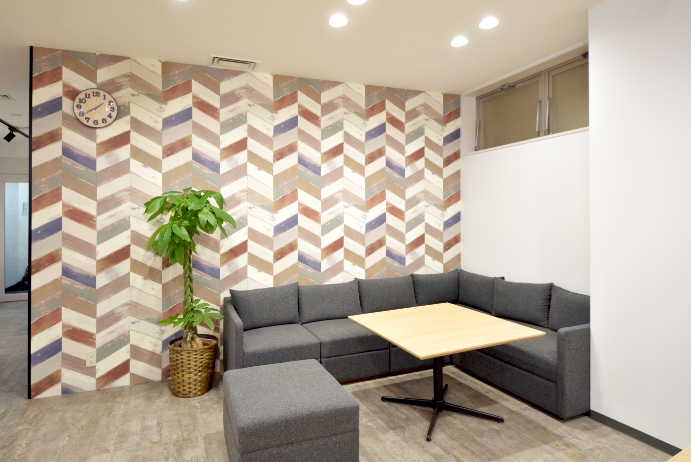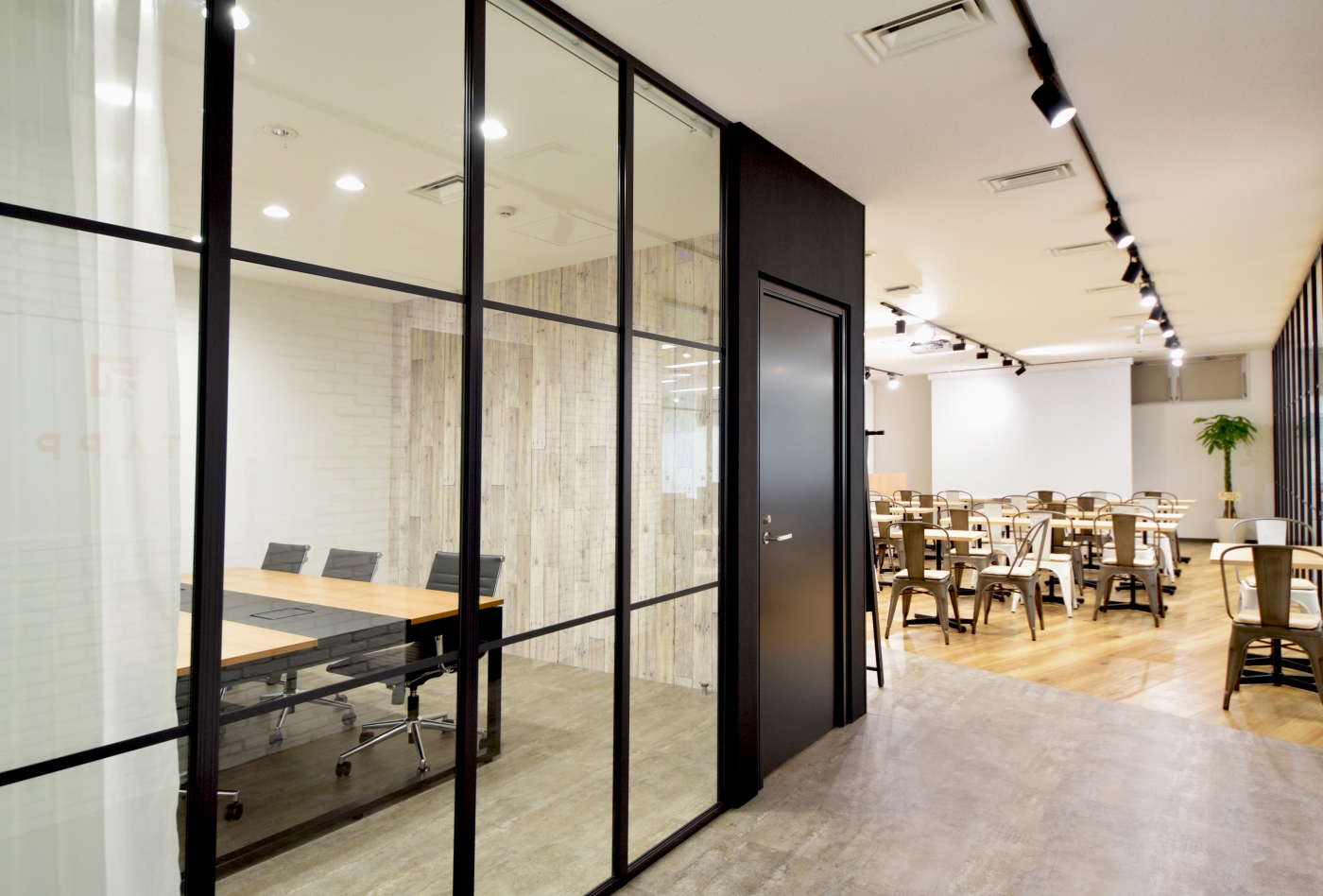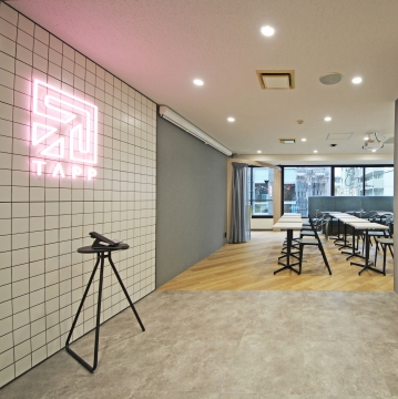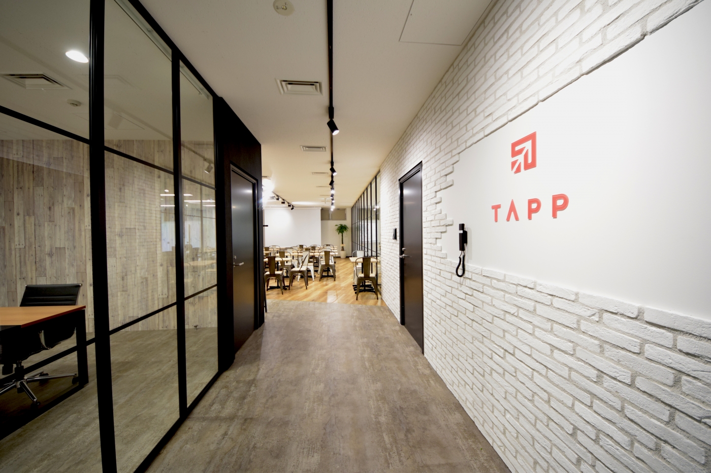 エントランスのブリックタイルとガラス間仕切りが印象的なカフェのようなオフィス。エントランスにはTAPP様がデザインされたロゴマークが映えるように、サイン以外は白いトーンで合わせつつ、タイル素材を用いることで空間に動きを演出しています。エントランススペースを抜けると、ガラス間仕切りで仕切られたセミナースペースとワークスペースが広がり開放的な空間となっています。セミナースペースには全て可動式の家具を取り入れており、無駄がなくフレキシブルな使い方を可能にしつつ、カジュアルなデザイン家具をチョイスすることでカフェ空間を演出し、居心地の良さをつくりだしています。エントランスから会議室、セミナースペース、そしてワークスペースまでも統一されたデザインで空間を構成することで、オープンで一体感のあるお洒落なオフィスに仕上がりました。