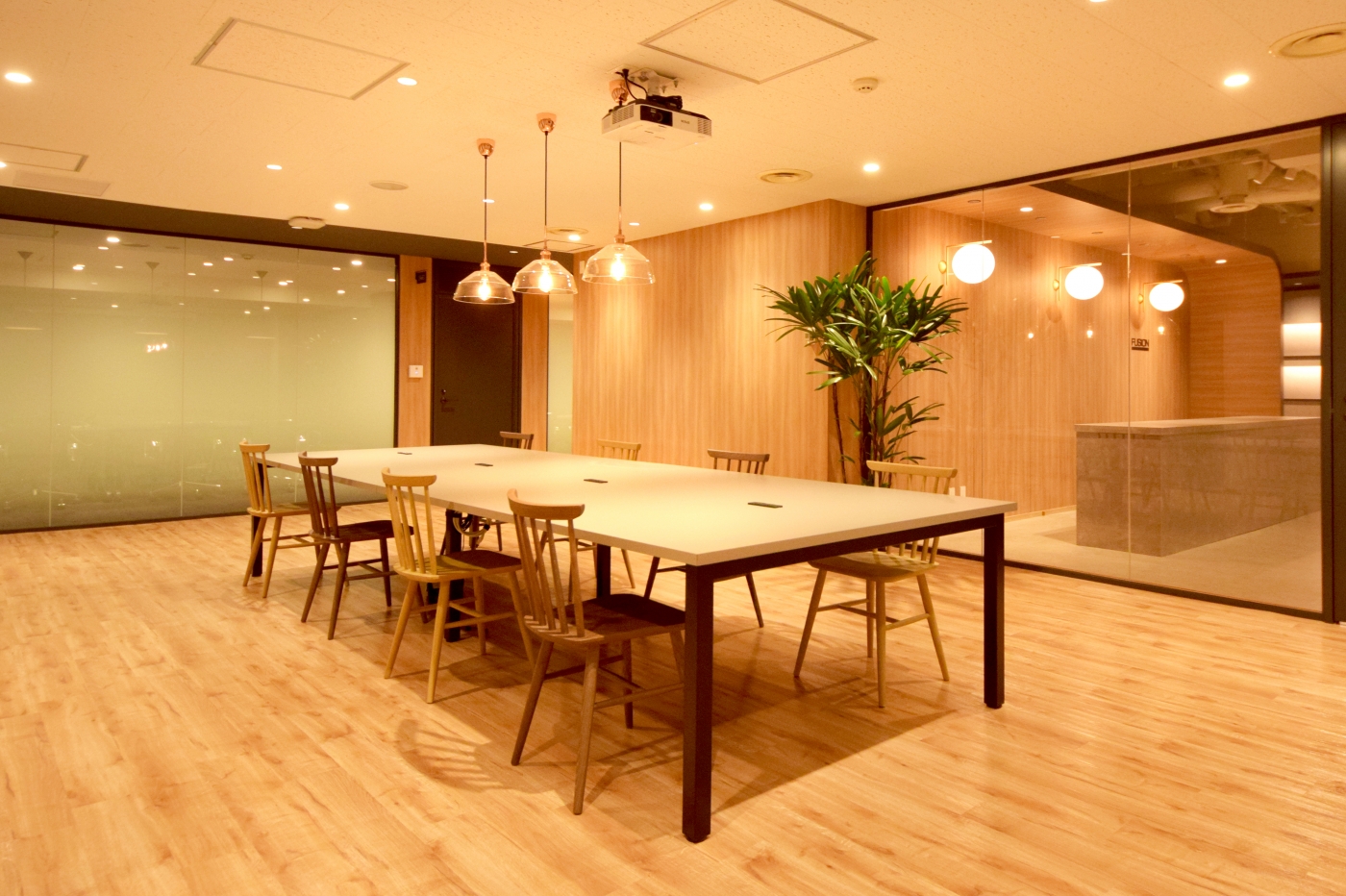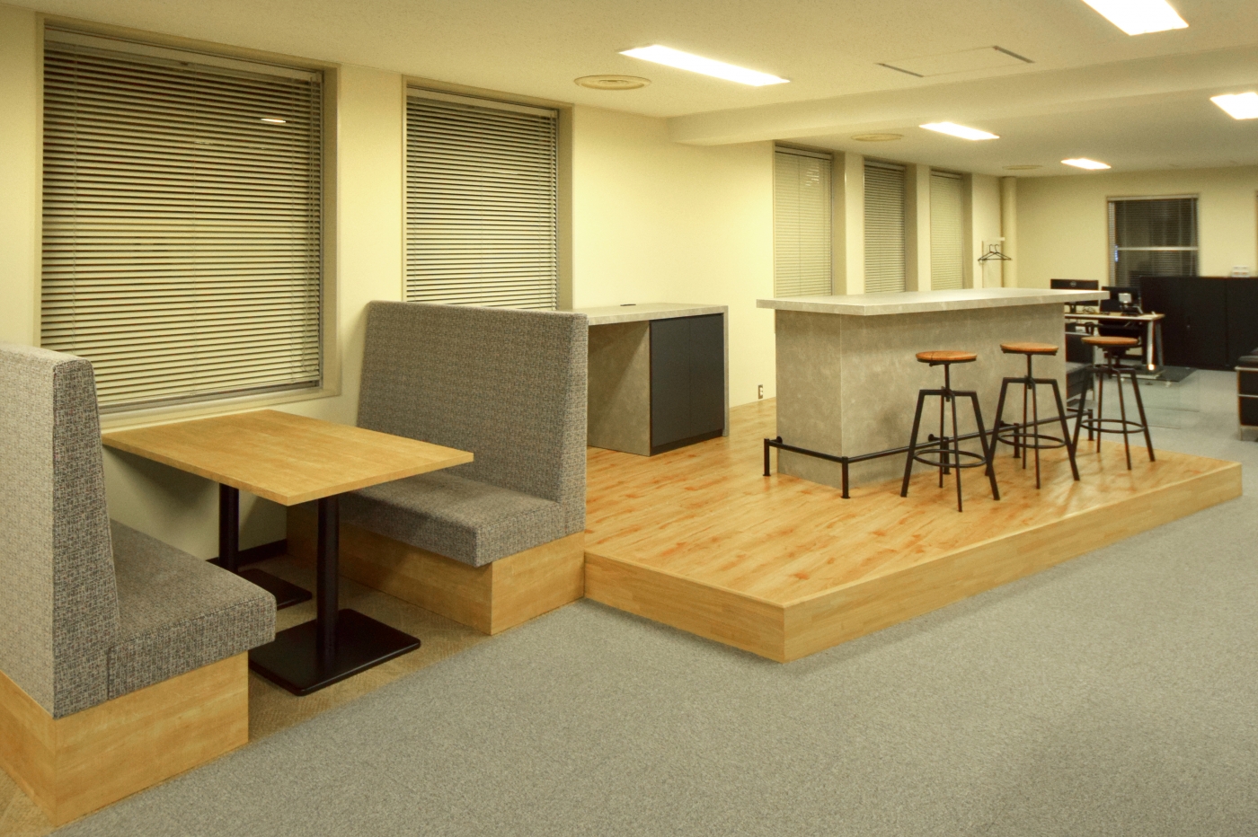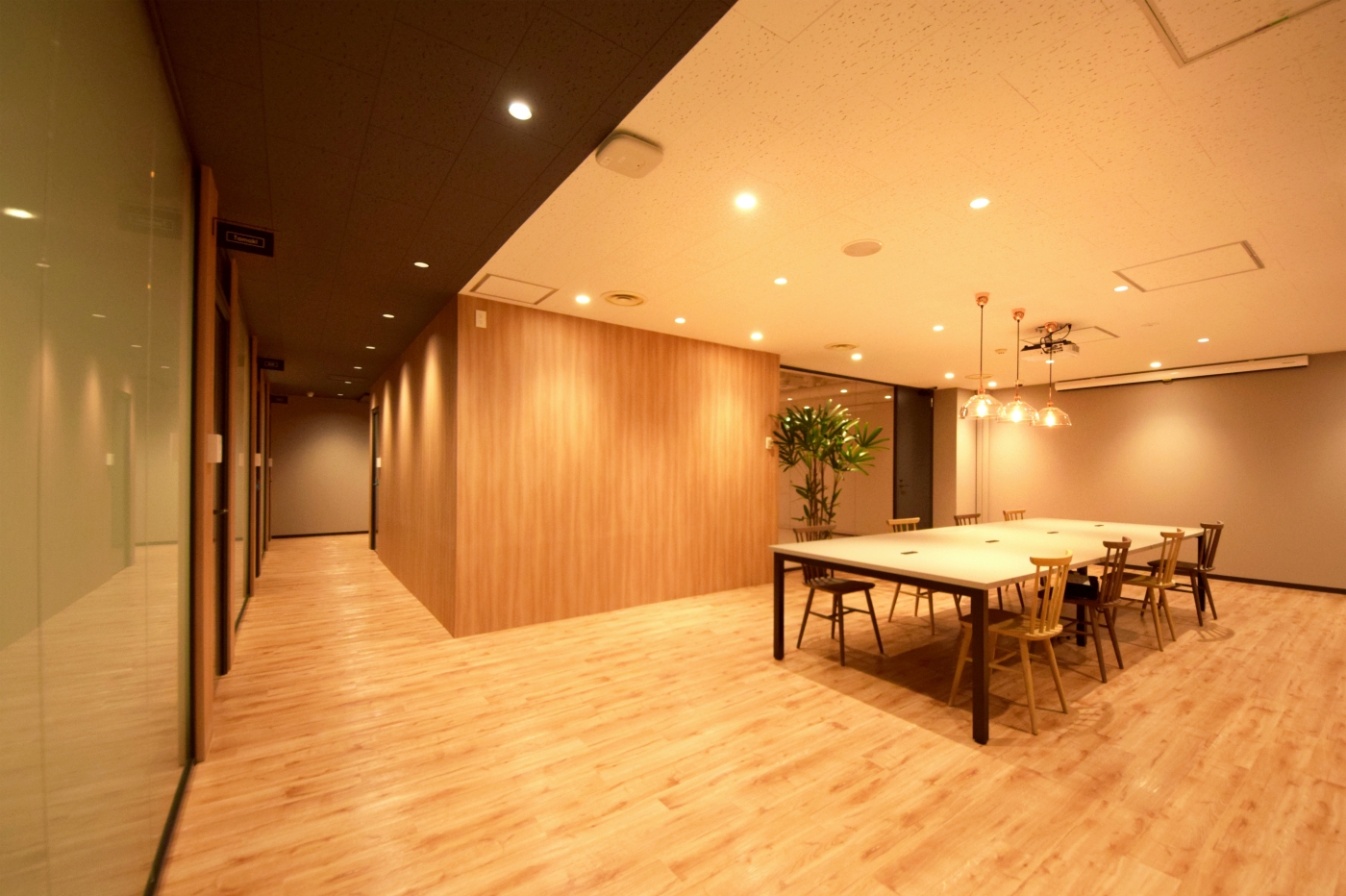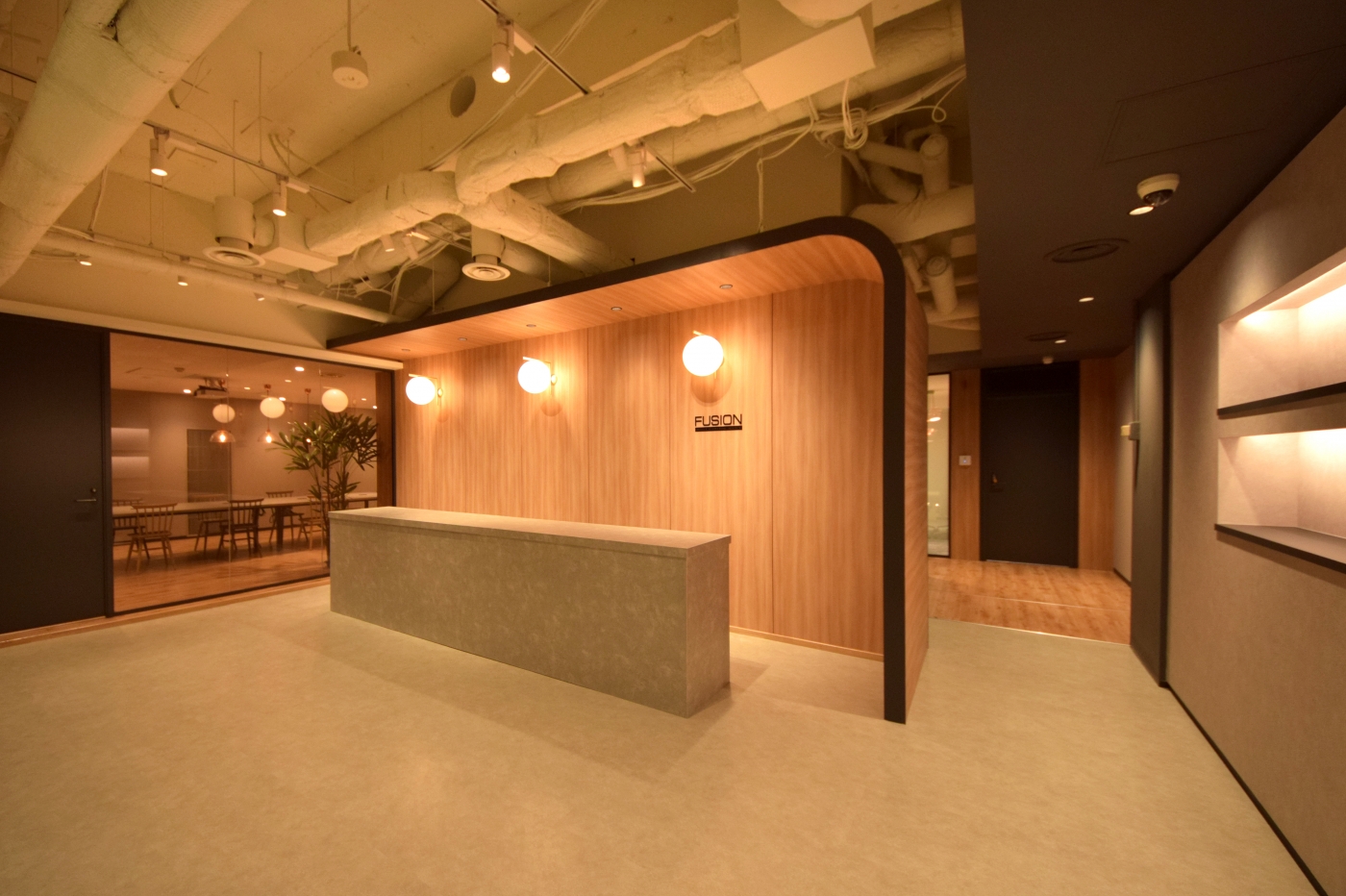 今アツい北海道。そんな北海道の中心地、札幌駅から直結という最高のアクセスのビルへ移転したフュージョン様。新しいオフィスでは、新しい働き方のご提案をさせていただきました。今回のオフィスづくりの基本となったのは、「アフォーダンス」。例えばイスがあれば人は座るという行動を起こすし、ハンドルがあれば回すという動作を取ります。それがアフォーダンスという考え方です。ワークスペース内は、柱や壁をホワイトボード塗装で仕上げており、いつでもディスカッションができるように。ソファやカウンターをいたるところに設置してカジュアルな打ち合わせを促し、さらにはオフィス内の回遊性を高めて部署間のコミュニケーションが活発になるように工夫しています。デザインは、全体的に落ち着いた木目と黒を基調に、温かみがありつつも引き締まった印象を与えるエントランスに。一部はスケルトン天井にして、新しいトレンドも感じさせます。 新しい働き方や取り組み、新しいコミュニケーションが生まれる、素敵なオフィスが出来上がりました。