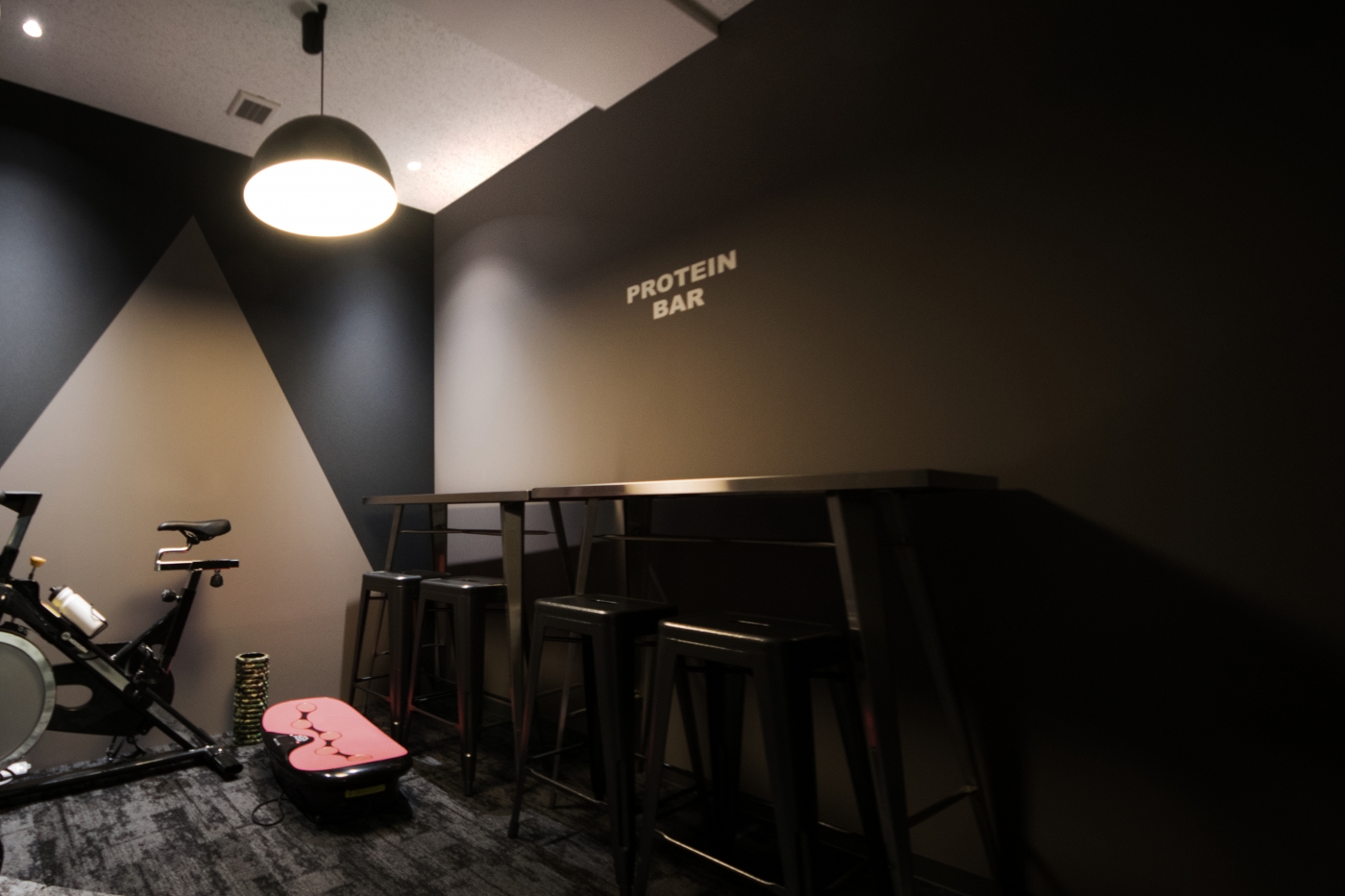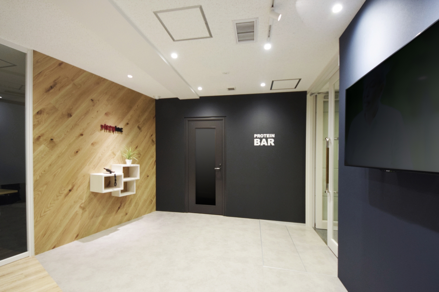 人員増加にともなう、2フロアから1フロアへのご移転。メインとなるエントランスには木材を斜めに貼る事で奥行を演出し、会議室にはガラスを多用する事で空間を広々とみせました。床や壁に木目やモルタル調という異素材を使い、温かみとシャープさのメリハリをつける事で、洗練されたデザインに。訪れる皆さまに商品を見ていただけるよう、入ってすぐのエリアにディスプレイ棚やモニターも完備し、可動棚なので商品の増減にも対応可能です。プロテインバーは他とは違う雰囲気を出すべく、黒基調でシャープなイメージに。今後のさらなる躍進を感じさせるオフィスとなりました。