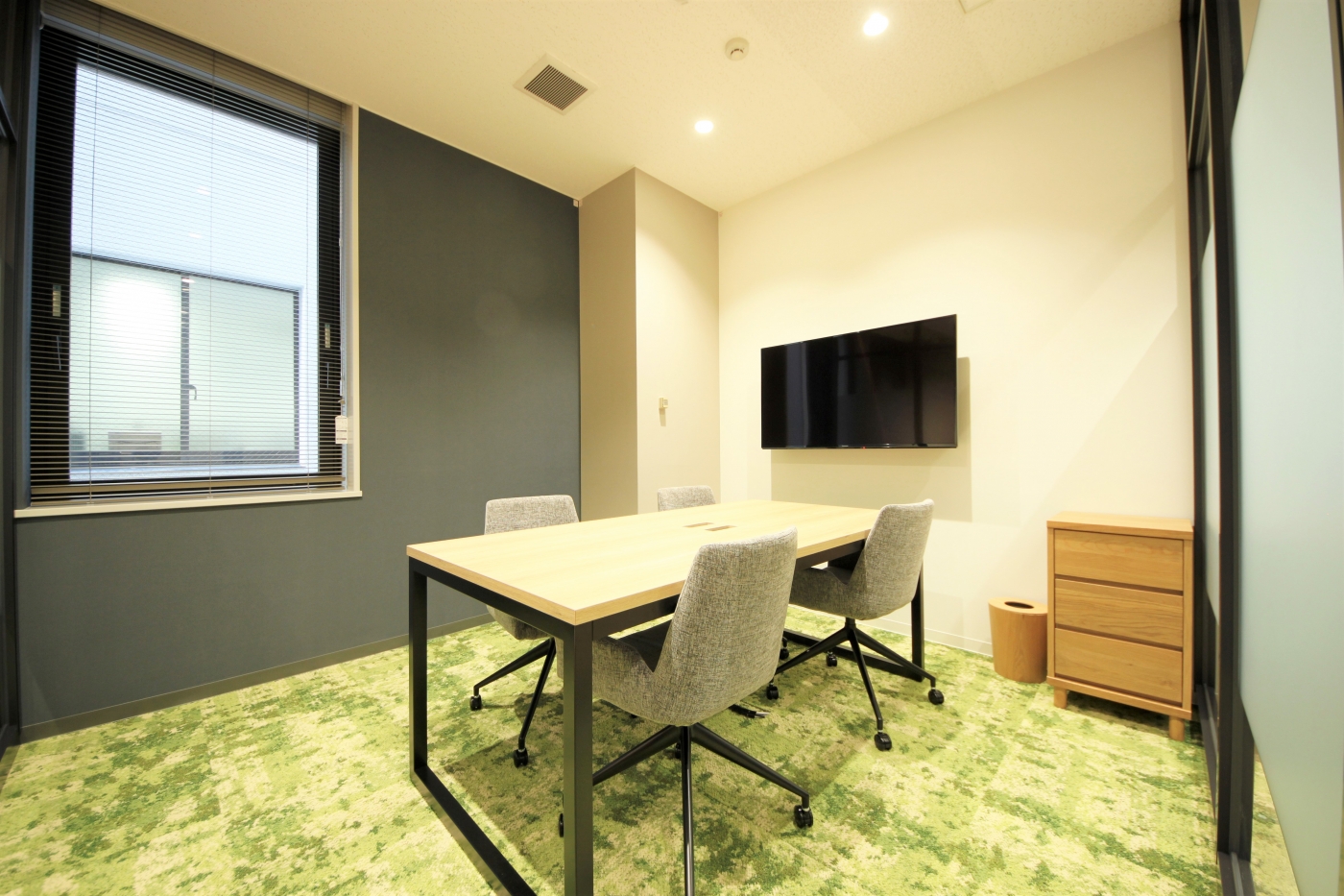 エントランスで来訪者を迎えるのは素材にこだわった突板のカフェカウンター。奥のドリンクコーナーとソファスペースはカジュアルとフォーマルのバランスが取れたデザインです。ガラスでできた会議室の床はグリーンでナチュラルさを感じさせ、ワークスペースへといざなうように続いています。ワークスペースには中心のシンボルツリーを囲うようにスツールを設置し、リラックスをしながらも集中力が高まるオフィスデザインです。