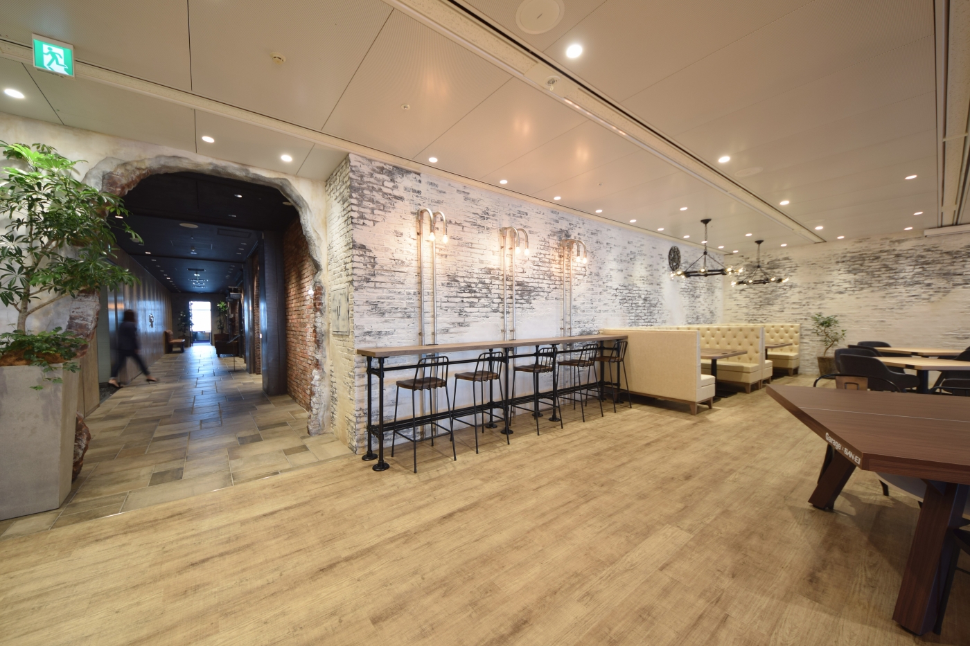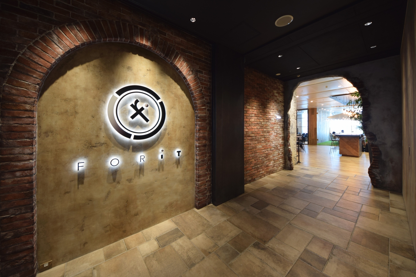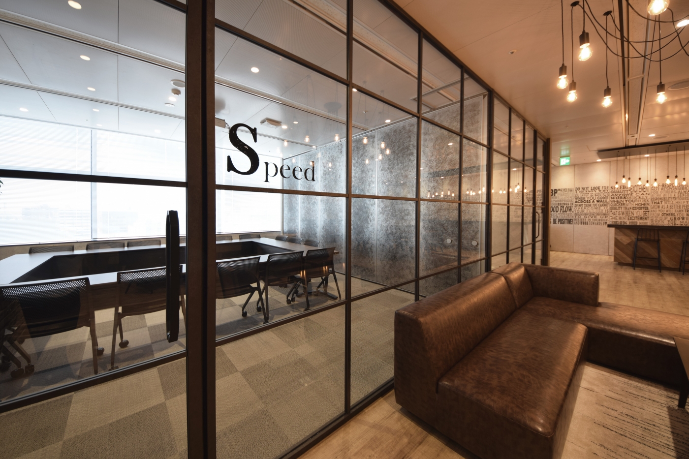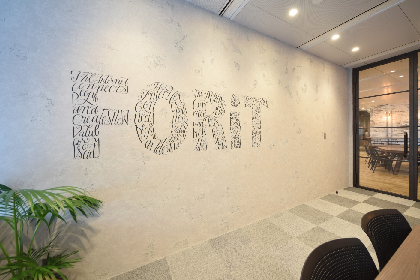 今までのオフィスの隣の区画を増床して、新たに執務エリアとコワーキングを新設させました。今までのエントランスエリアはそのままに、その一画の壁を打ち抜くと、この「TSUNAGU」(コワーキングエリア)があったというサプライズ的演出。これまでのオフィスの世界感を引き継ぎつつも、新たなフォーイット様らしい空間がそこには広がります。壁面にはクレドや企業理念を、アートによって表現。空間全体には、エイジング加工をふんだんに取り入れ、空間全体の演出力を高めました。