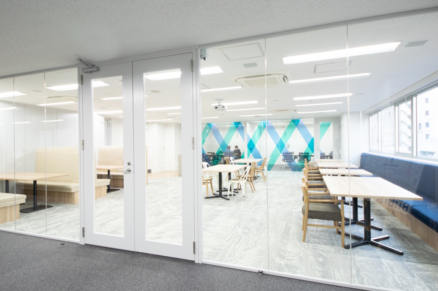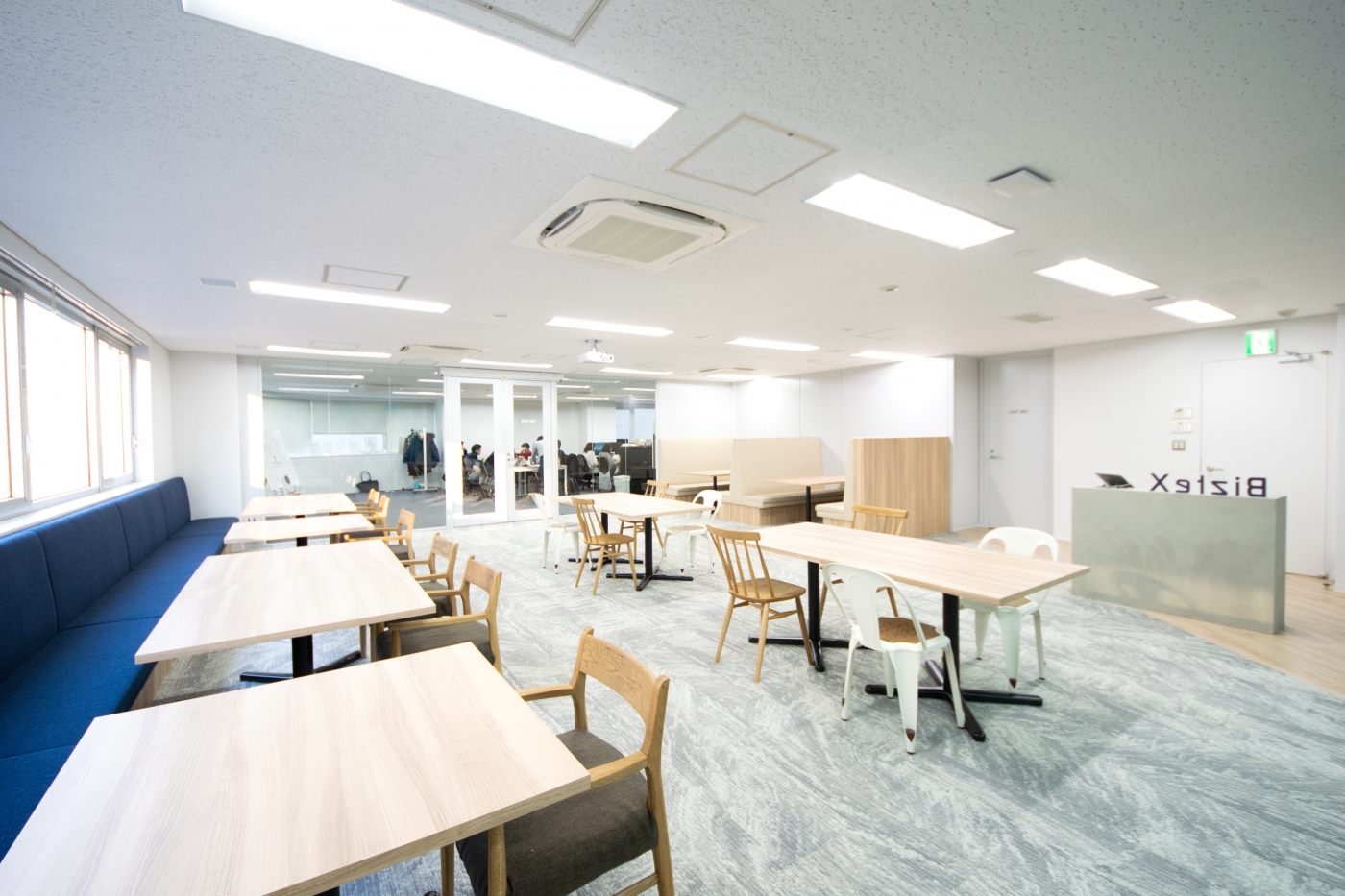 エントランスはセミナースペースの空間と融合しており、開放感あふれるオフィスとなりました。セミナースペースとオフィスエリアを分ける壁面はガラスを使用し、両開きのガラスを使った扉にすることで、オフィス全体の一体感を感じつつもしっかりと空間を分けています。ミーティングルームのガラス壁面にはシートで”X”の文字を表現することで企業ブランデングを図り、オフィスに全体からBizteX様を感じられるよう意識しました。