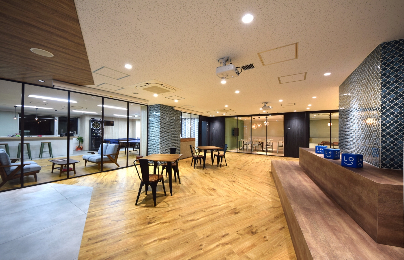 イベントスペースと会議室、執務エリアはガラス間仕切りで仕切り、解放感を演出するのと共に、社風を来客の方へ伝えるという効果もあります。床の木目の貼り分けと天井の木目クロスの張り替えのラインをそろえることで空間に動きを出している所もポイントです。モルタル、モザイクタイル、ガルバリウム鋼板など珍しい素材を各所に取り入れ、お客様の視線を惹きつけます。大人数のセミナーに対応するために、ひな壇を設けイベントスペースの中心に象徴として設置しました。普段は社員の皆様がお使いになり、セミナーやイベント時は来客用に開放する多様な使い方ができるオフィスです。