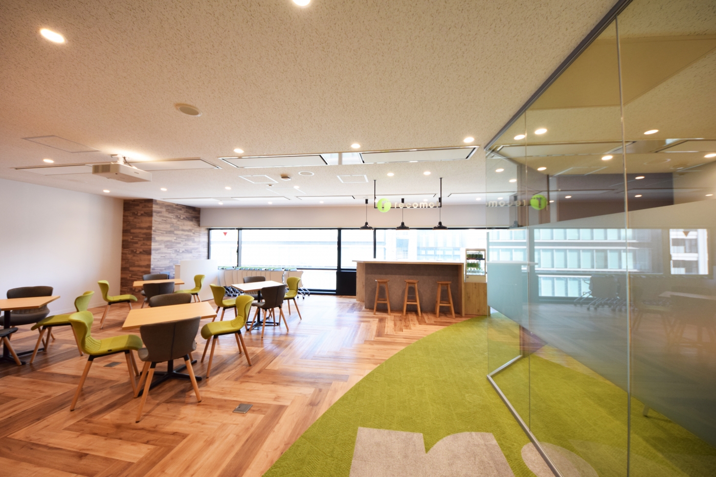 「GARDEN」をプロジェクトコンセプトとして掲げ、これまでの働き方に「刺激」を加え、社内外のコミュニケ―ションをさらに活性化させるオフィスをプランニングさせて頂きました。常時フリースペースとして開放しつつもセミナー等多目的に利用できるエリアを設けることで、外部の方との交流を深められるよう構成しております。エレベーターが開いた途端目に飛び込んでくる発光サイン、来客エリアの天吊サインとロゴをかたどったタイルカーペットが企業ブランディングを高めます。