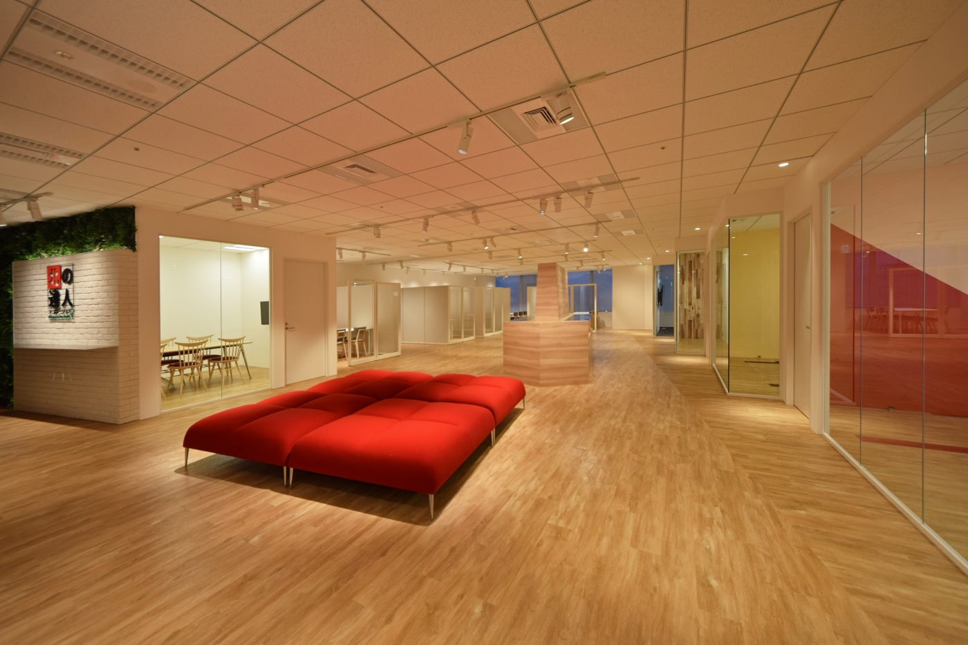 DESIGN デザイン 今回、3度目のお手伝いをさせて頂いた北の達人コーポレーション様。札幌の中でのハイグレードビルの高層階へのご移転でした。ビルとしての最高の環境を最大限に活用できるように設定したコンセプトは「ミセル」。お客様がいらっしゃるエントランスエリアでは各会議室にテーマを設けて家具、クロス、照明をテーマごとにデザインし、壁をガラスにすることでブランドイメージを見せられるようにしました。また、そのほかの壁も可能な限りガラスにすることで高層階ならではの眺望を見て頂けるよう工夫しました。動線、視線の誘導を意識し、ブランドイメージ・高層ビルの景観・社内環境、全てをミセル。「ミセル」オフィスが出来上がりました。