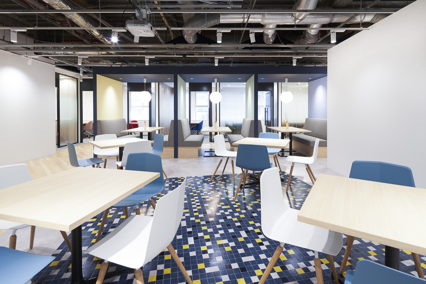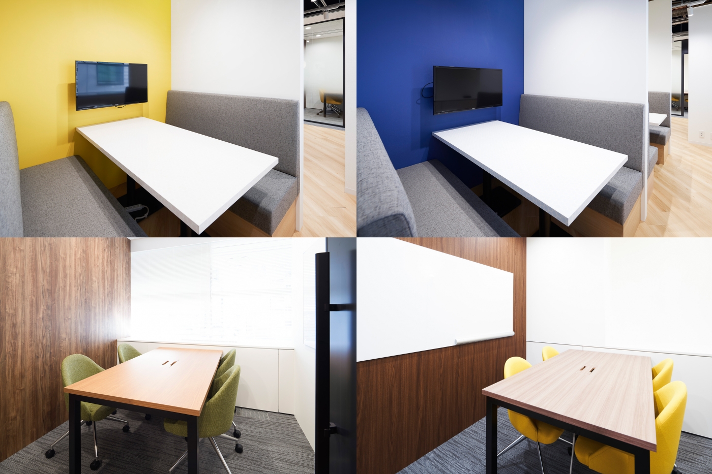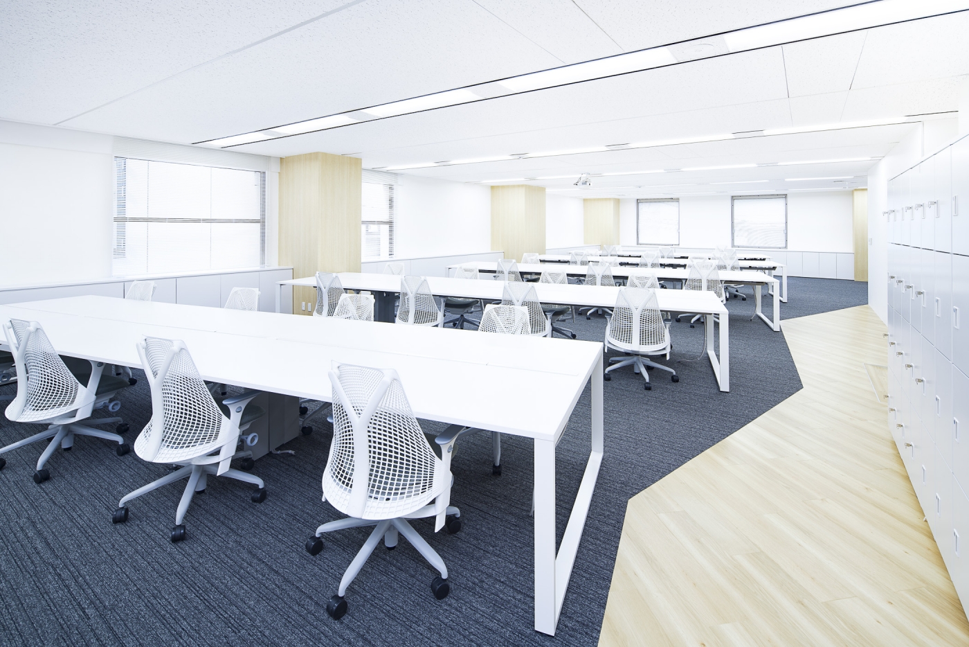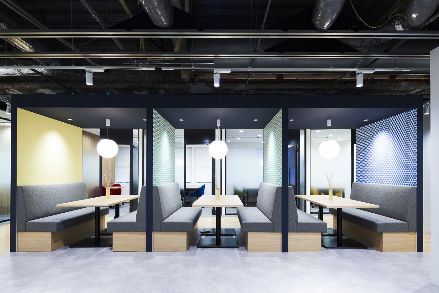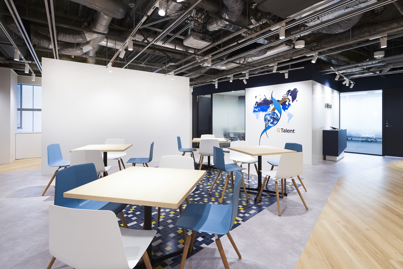 新サービス「G Talent」のリリースに合わせたご開設プロジェクトです。今回は本社で使用している幾何学模様ではなく、グローバルな人材が集まる場という意味を込めて、細かな四角の模様を用いて空間を作りました。また、今まで白x青を基調としたオフィス作りをお手伝いしてきましたが、今回は各会議室にも異なる色の椅子を入れるなど少し違った要素を取り込んだ空間となっています。オフィスの中央にはアーティストの方にアートも描いて頂き、他にはないオリジナルなオフィスに仕上がりました。