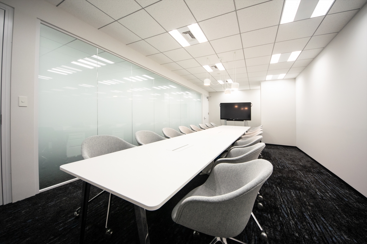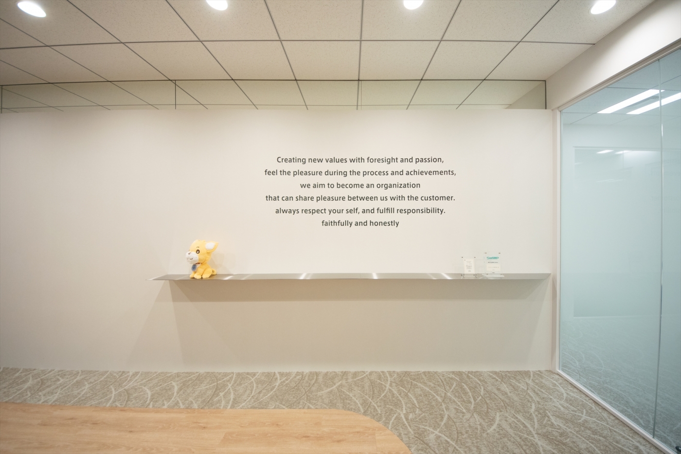 位置情報など衛星を利用したサービスを展開していることから、コンセプトを『宇宙』とし全体のデザインに落とし込みました。会議室にはそれぞれ、「ベガ」「アルタイル」「シリウス」と星座の名前をつけて、夜空に輝くデザインのオリジナルネームサインを制作するなど細部までこだわりを持ちました。ペンダントライトが執務室内から見ると星が浮かんで見えるように、会議室はガラスのパーティションで間仕切りました。エントランスは白を基調とした壁紙に会社のキャッチコピーをデザインし、ブランディングの効果を図っています。暖かい雰囲気の床材を使用し、貼り分けを曲線にすることで全体的に清潔感のある柔らかい空間を演出しました。全体的に清潔感のある明るいオフィスとなりました。