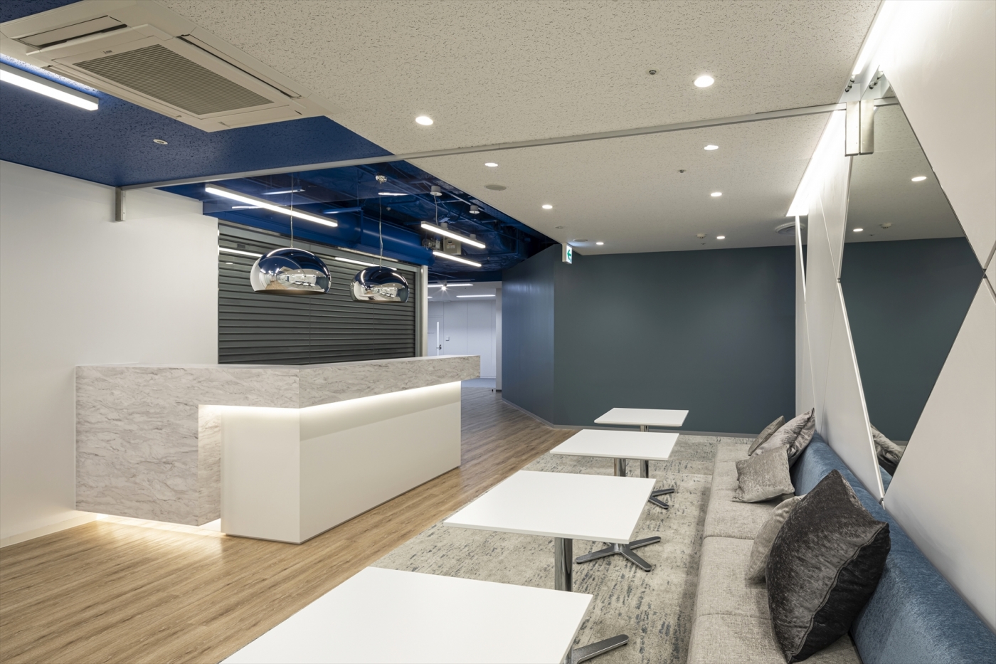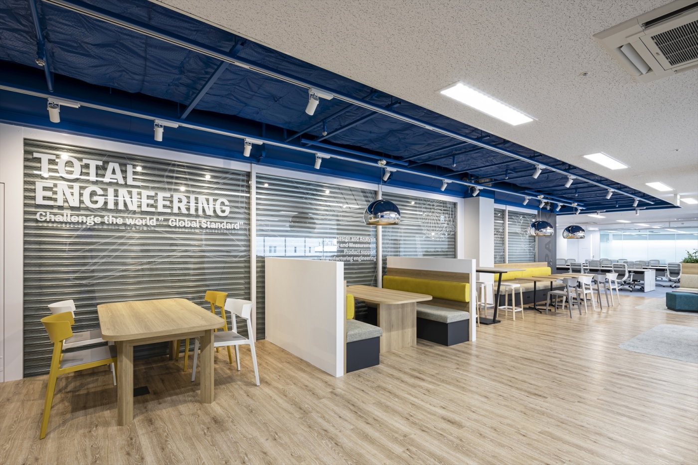 名古屋・栄にあるナディアパークにて、オフィスデザインと施工をさせていただきました。元々は書店が入っていたフロアということもあり、ユニークな形の区画を活かしたオフィスレイアウトを考えました。オフィスの中心には書店の時に使用されていたエスカレーターがあり、そこをぐるりと囲むようにフリースペースを設けました。エスカレーター用の防火シャッターはあえてむき出しにしてデザインの一環として取り入れ、中菱エンジニアリング様の事業内容を表現したグラフィックを大胆にあしらいました。自席以外でも集中作業ができるスペースや、社内ミーテイングを行うことができる環境があるため、ワーカーが働き方をより自由に選択できるオフィス空間となっています。