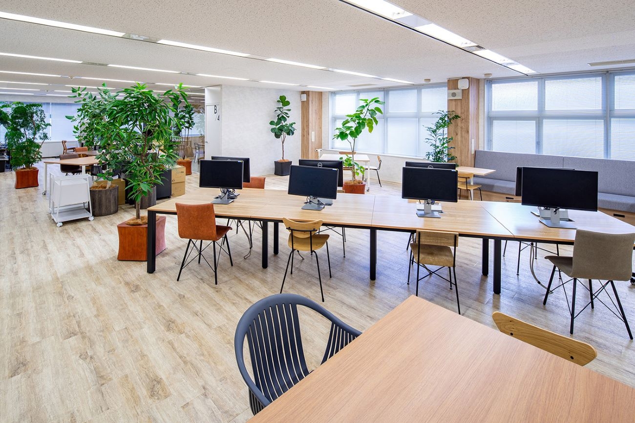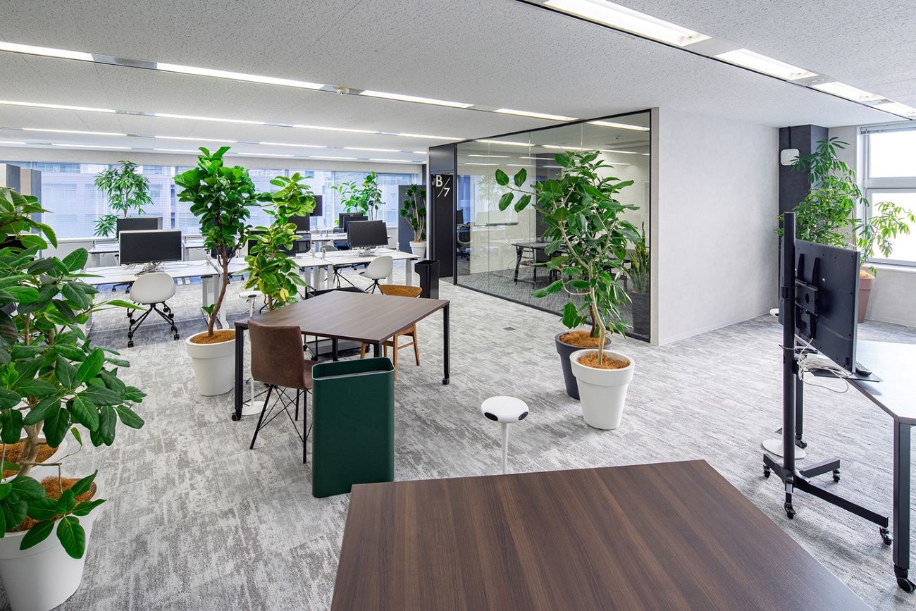 コミュニケーション・コラボレーションに特化したオフィス空間を完成させました。柔軟性・緑化をキーワードに、レイアウトは協業やオフラインでのやりとりのしやすさを追求した家具で構成し、どこにいても人の気配を感じられるようなフラットなデザインに仕上げました。コミュニケーションに重点を置いた空間では、温かみのある色みで構成し、集中・ソロワークに重点を置いた空間ではモノトーンで構成するなど、オフィスが複数フロアに分かれていることを利用して、各フロアにそれぞれ特色を設けました。私たちが配置したレイアウトプランが完成ではなく、今後、オフィスを使う中で、スタッフの方々自身でアレンジし、新たな空間構成を構築、進化させていくアジャイルオフィスとなっております。