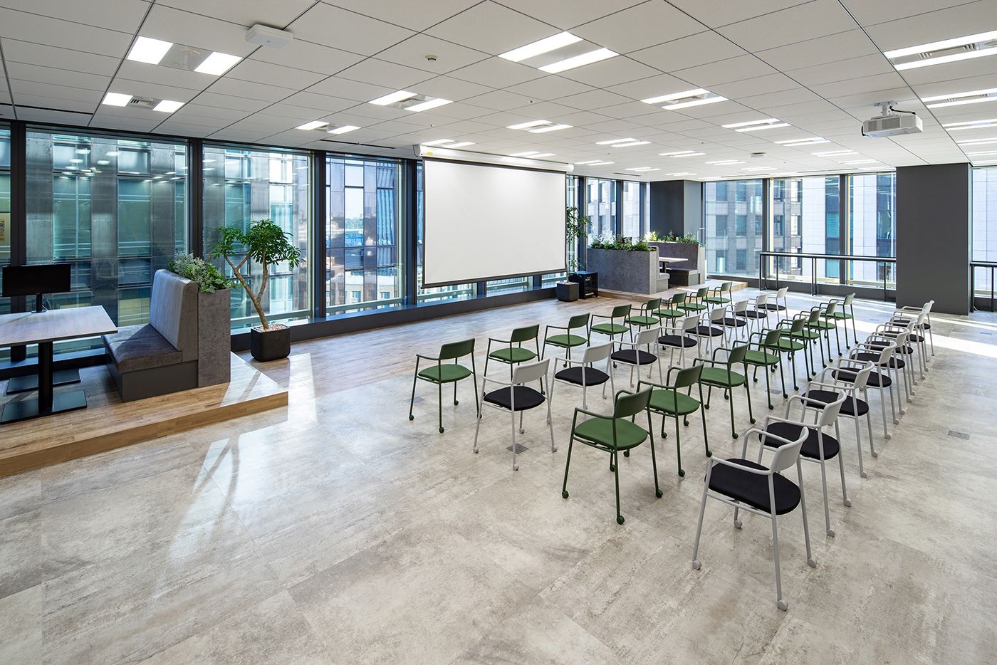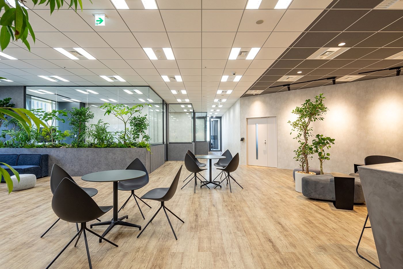 お客様が自由に利用できる全席フリーアドレスのワークラウンジを立ち上げるプロジェクトでした。 多様な働き方の実現と世界への発信力を強化することを目的としたフラッグシップオフィスを目指しました。 エントランスから続く空間には、カフェコーナー、オープンミーティング、プロダクト展示エリアと、様々な機能を設計。多様なコミュニケーションが生まれる場所となりました。 会議室はガラス面を多用し、外光と開放感を最大限取り入れました。また、部屋ごとにデザインを変えることで用途に応じた会議室の選択ができるのも特徴です。 セミナールームは可動式什器をメインにしたことで、その日ごとに什器を動かし、日々の働き方をアップデートできる空間を演出しました。 このオフィスを中心に新しい技術とコミュニケーションが生まれ、発信され世界を変えていく。そんな期待と仕掛けが詰まったオフィスとなりました。