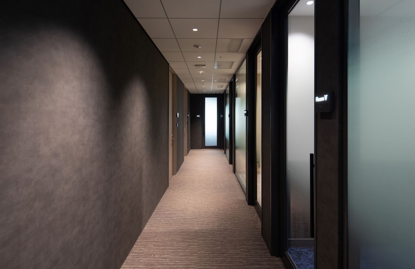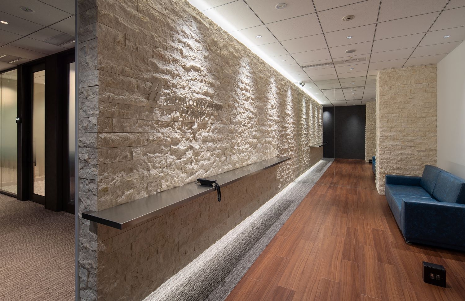 DESIGN デザイン 今回のオフィスではフロアまたぎだったオフィスを1フロアに集約させることでの業務効率の改善を図っております。エントランスは、140年以上にわたり積み上げてこられた歴史と信頼を石積みで表現し、重厚感のあるデザインにしました。奥へと続く廊下に面した会議室にはホッタ様が手掛ける商品の多彩な魅力を表し、各部屋をコンセプト分けしました。また執務室は、浜離宮恩賜庭園越しに広がる海を臨める眺望を活かし、ガラスを多用した風通しの良い空間となっております。日々の使い勝手を細かく落とし込んだ設備で業務の効率化を図りつつ、オープンカウンターやリフレッシュエリア、個別ブースなど、これまでのオフィスに無かったエリアを設けることで、新しい働き方や交流が生まれるきっかけを創出するオフィスとなりました。