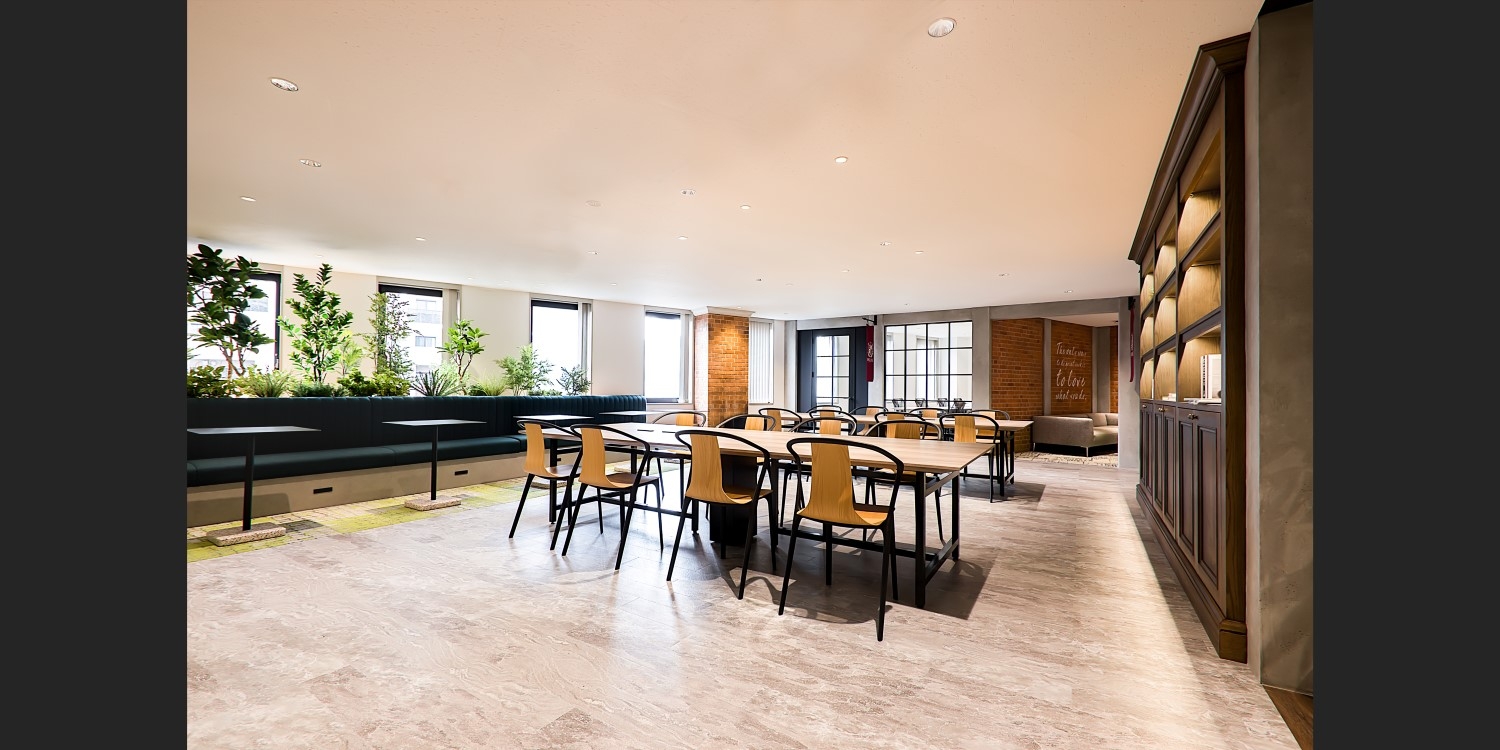 新たな事業領域としてリカレント教育を展開するタイミングでのオフィス増床移転。そのターニングポイントに相応しい機能性とデザインとは何かをクライアントとプロジェクトメンバー全員で考え抜きました。リカレント教育は、大人がスキルを身に着け直す、学び直す教育機会。働きながら学ぶ、学校以外での学びの場として機能する一翼を担うオフィスになればと想いを込め、『CAMPUS』をコンセプトに掲げ、ブランドロゴも作成しました。ブリックタイル調のエイジング塗装をはじめとするマテリアルやフラッグ等のディティールにもこだわり、落ち着いたクラシカルな空間で伝統と重厚感を感じさせます。知的な印象や貫禄をイメージさせる空間構成を目指しました。対外的にも安心感と同時に力強い印象を与えることができ、リクルーティング・リブランディングに繋がるデザイナーズオフィスが完成しました。