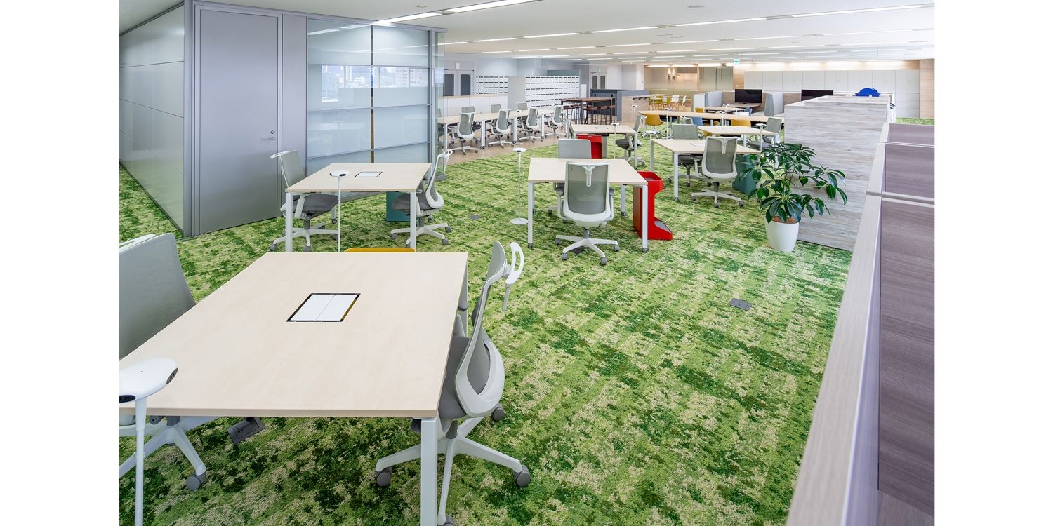 温かみのある木目やグリーンが印象的。開放的なフリーアドレスオフィス