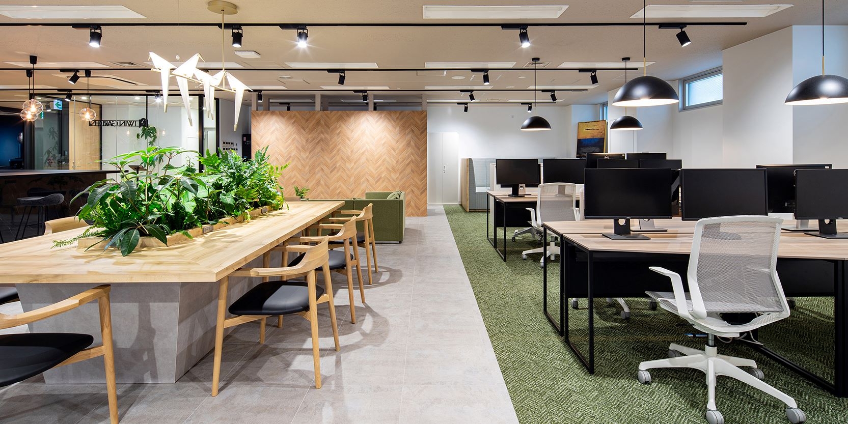 自由に働き方を選択できる木とグリーンを基調としたオフィス