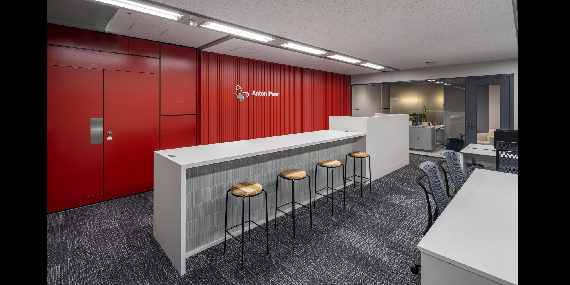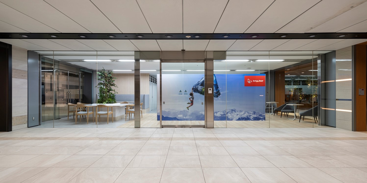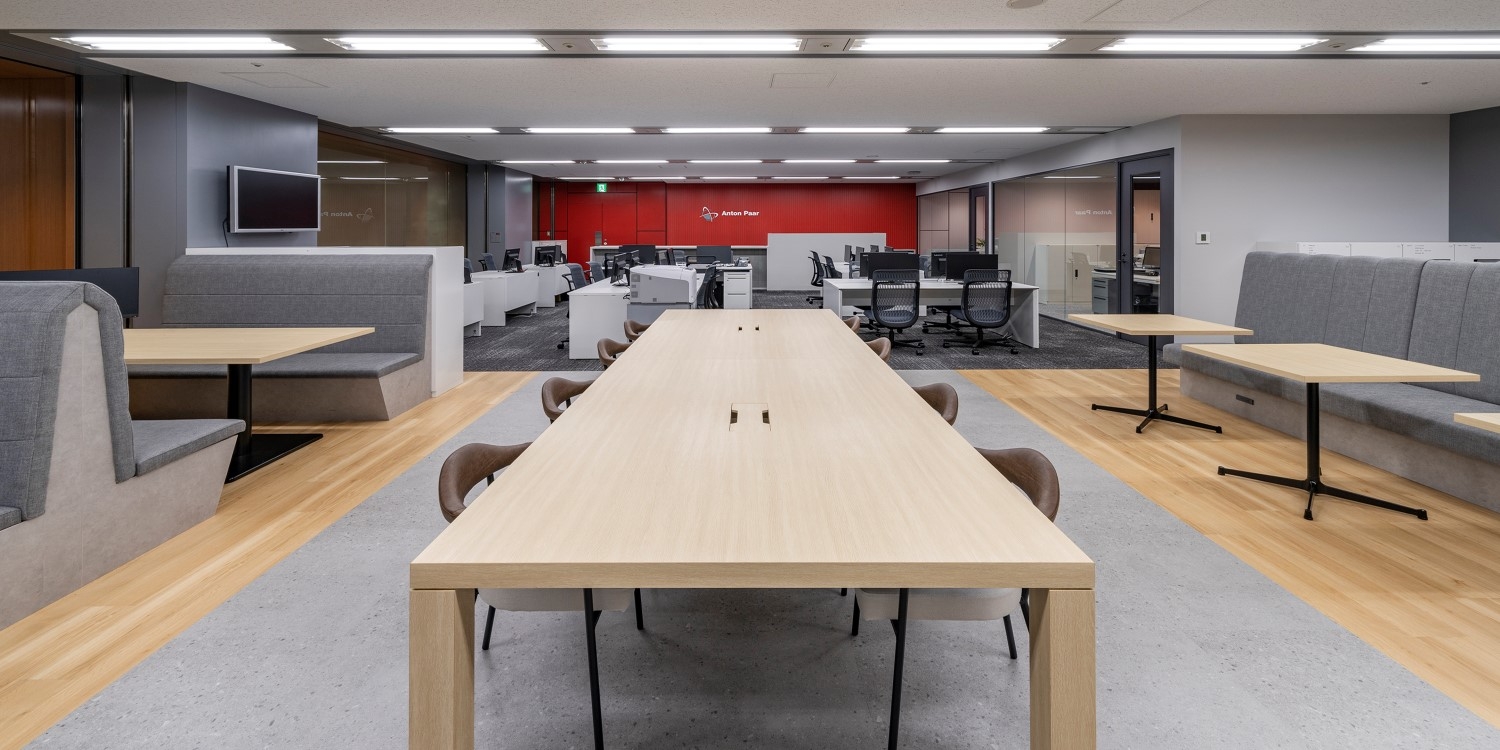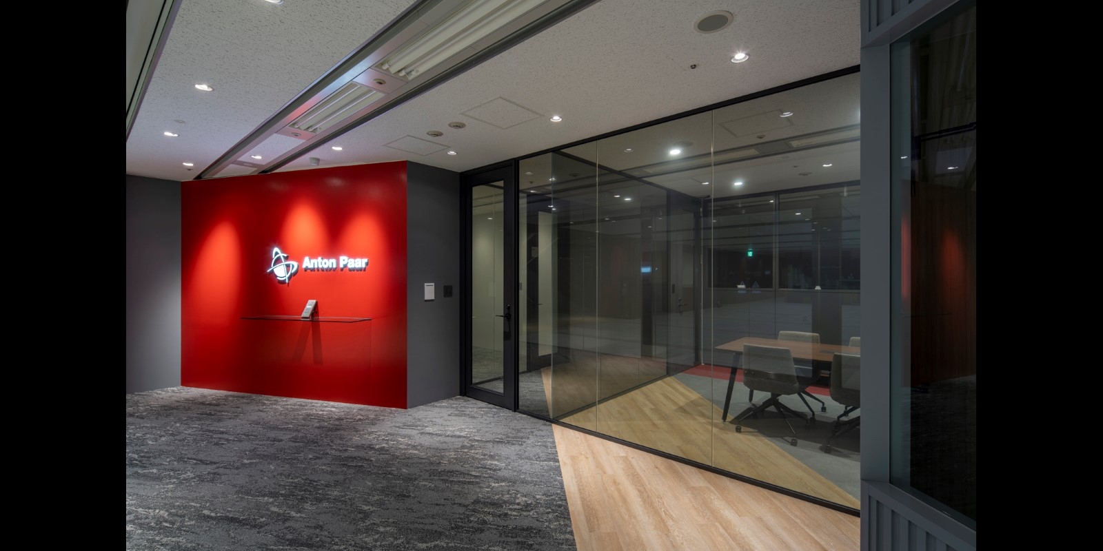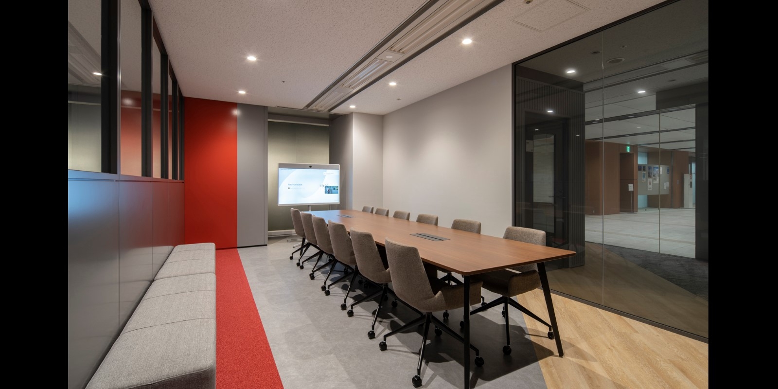 DESIGN デザイン 墨田区にあるシンボルオフィスビル1階の2区画に、同ビル13階から移転するプロジェクトでした。コーポレートカラーである赤を基調とし、クールな雰囲気と柔らかいイメージの2軸で2つの区画をそれぞれデザインしました。オフィス面積の適正化に伴い、空間を広く使えず狭く感じるのではという懸念もありましたが、レイアウト効率を考えたほか、随所にガラスを使用することで空間を広く見せるよう工夫しました。