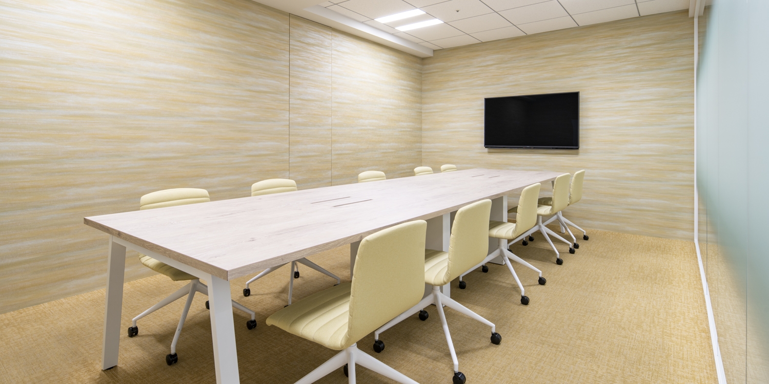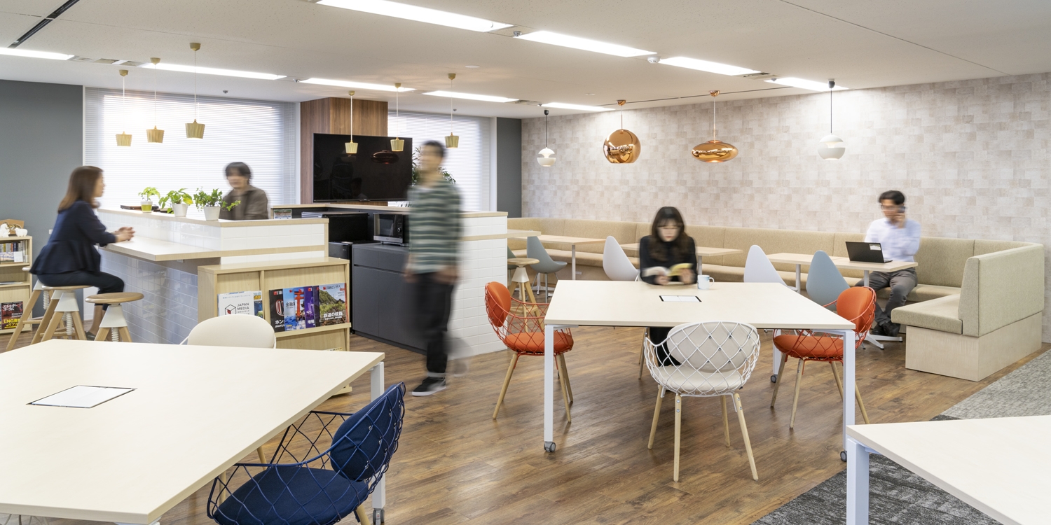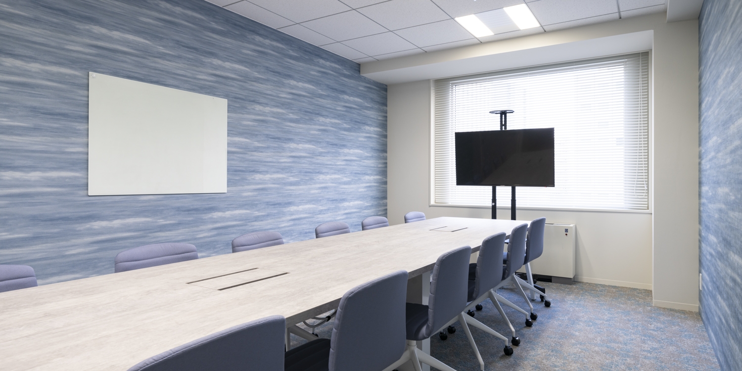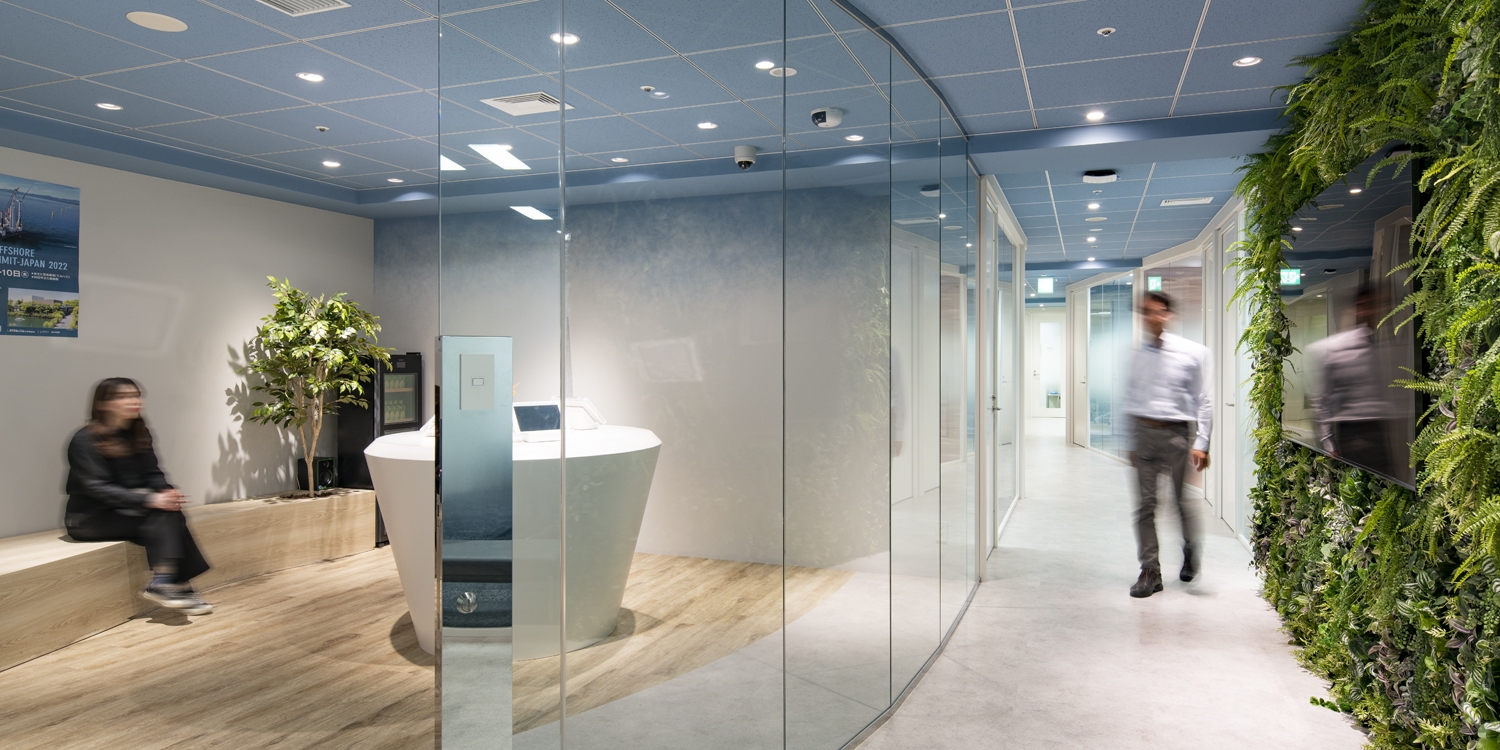 2年前の移転では、社員のエンゲージメント向上を目的にオフィスを構築。今回は社外へのブランド発信を目的に1フロア増床・2フロア改装を行いました。エントランス壁面には風車の絵を描き、事業である「風力発電」についての動画をモニターに投影して紹介。風車のオブジェも各所に設置し、来社する人にブランドを訴求しています。改装した7,8階の執務室は生産地を表現する「海、森、街」をイメージしてデザインしました。食事やリフレッシュ、ミーティングなど自由に使えるフリースペースにはソファやワークテーブル、カウンターなどを設け、社員の知的創造を高めコミュニケーションを促進します。増床した15階のエントランス・会議室は、空のように無限に広がる様子を発信となぞらえ「天空」をイメージしてデザインしました。12部屋ある会議室では、1日の中で移り変わる空の色を12色で表現しています。コスモエコパワー様らしさが光るオフィスとなりました。